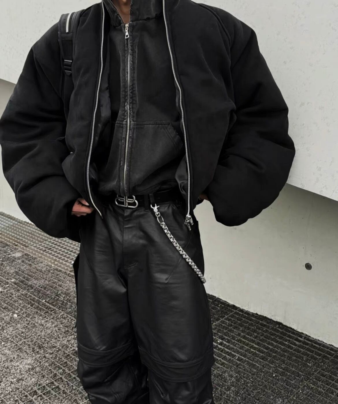 重厚感のあるMA-1 ボンバージャケットです。ダウンのような厚みとシンプルな洗練されたデザインが非常に美しいです。シックなブラックのカラーリングで、opiumやグランジスタイルとも相性が良いかと思います。クラッシュデニム、スラックスなど汎用性が高いアウターです。