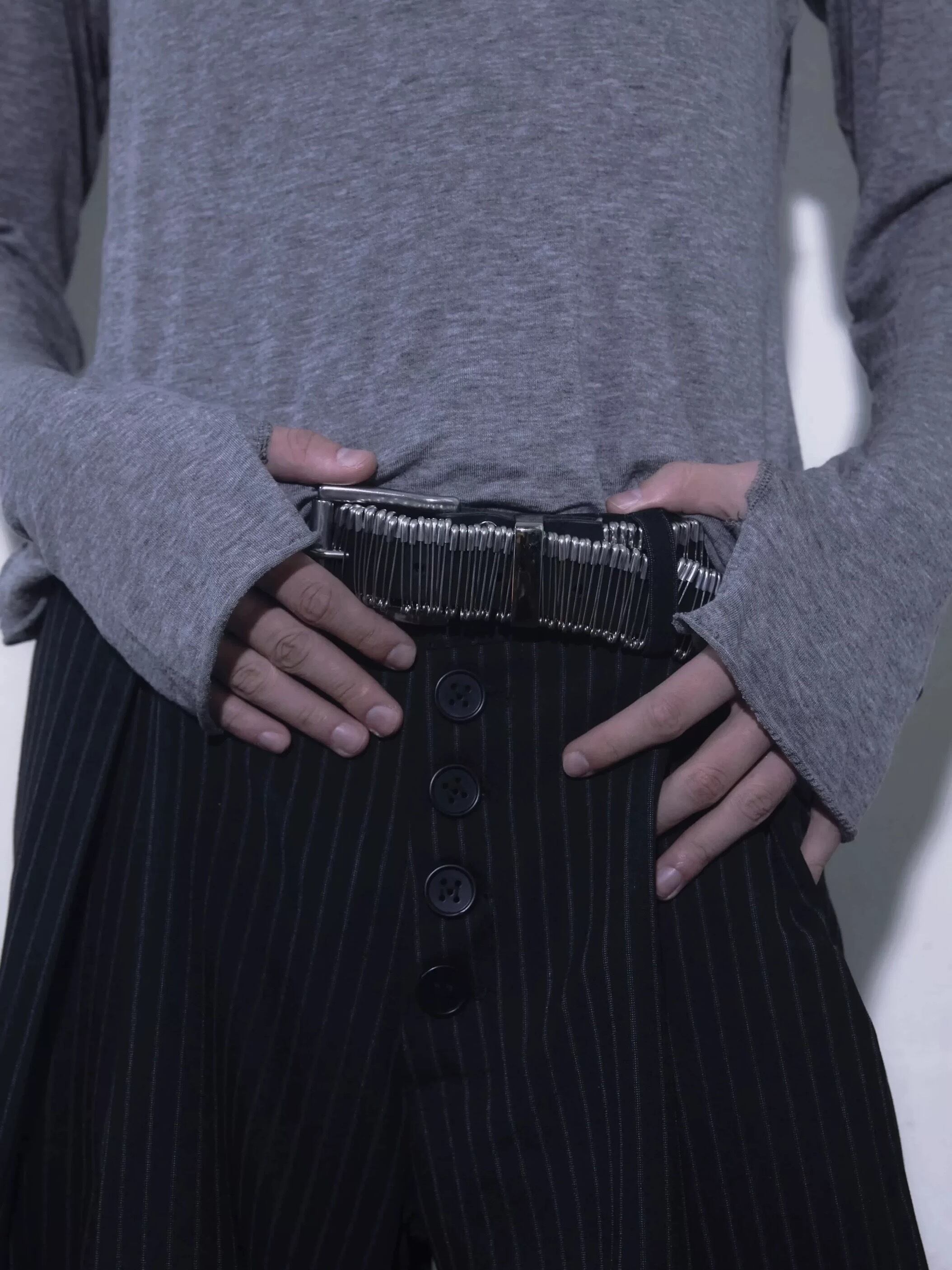安全ピンが夥しいほど散りばめられたY2K、グランジ要素の強いアイテムです。AFBのファーベルトにデザインが酷似しております。デニムやスラックスの上から着用し、シンプルなスタイルにも力強いアクセントを加えてくれるアイテムです。モードなスタイルにも落とし込めるかと思います。