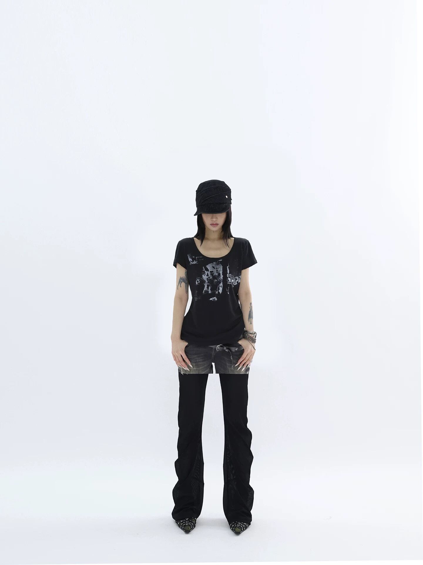 ミステリアスなグラフィックのデザインがプリントされたカットソーになります。奇妙で神秘的なデザインが唯一無二で、周りとは一歩先をゆくスタイリングに落とし込めると思います。デニムやスラックス、ローファーにスニーカーとどんなシーンの中にも合わせることが出来る万能アイテムです。