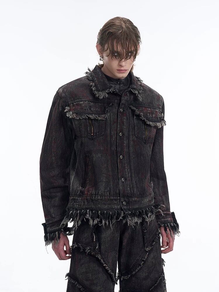 重厚感のあるブラックデニムに、繊細なダメージ加工と大胆なフリンジディテールが施された一着。