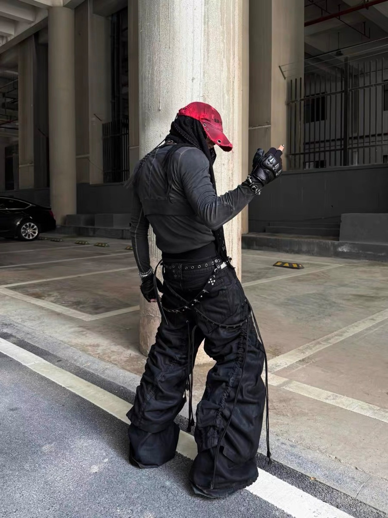 立体的なルーチドシルエットが特徴のドローコードパンツです。サイド全体に施されたレースアップ仕様がアクセントとなり、グランジやY2K、ストリートスタイルとも好相性。ワイドで余白のあるシルエットが抜群の存在感を生み、スタイルを選ばず着こなせます。パラシュートパンツのようなボリューム感と調整可能なストラップで、シーンに合わせたアレンジが可能な一本です。