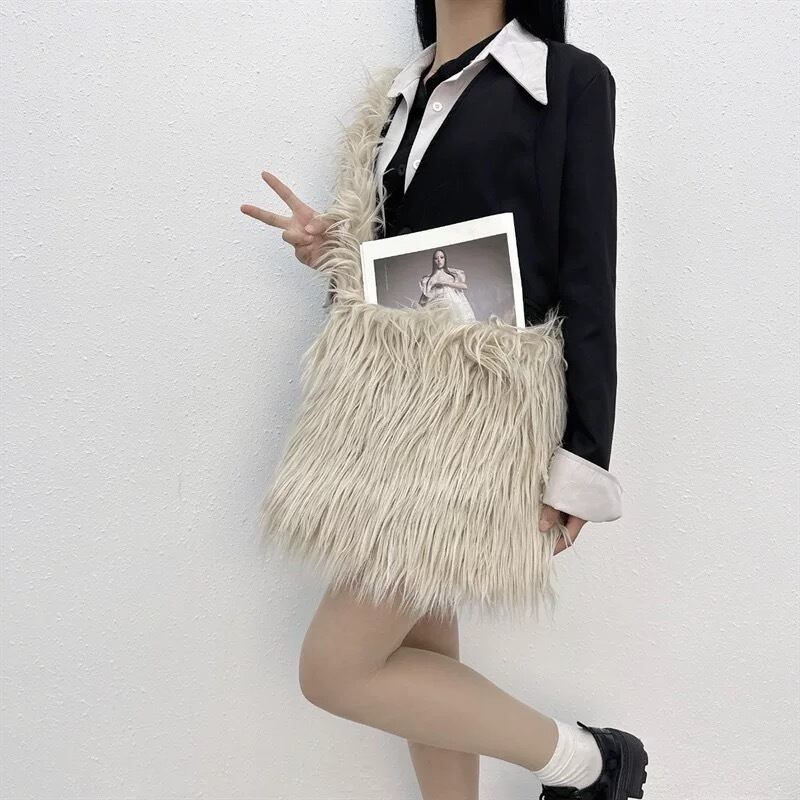 長めのシャギーファーが存在感を放つショルダーバッグです。柔らかな質感とボリューム感がコーデのアクセントになり、Y2K・グランジ・韓国ストリートとも相性抜群。軽量で持ちやすく、普段使いからお出かけまで幅広く活躍。冬コーデを一段格上げする主役級アイテムです。