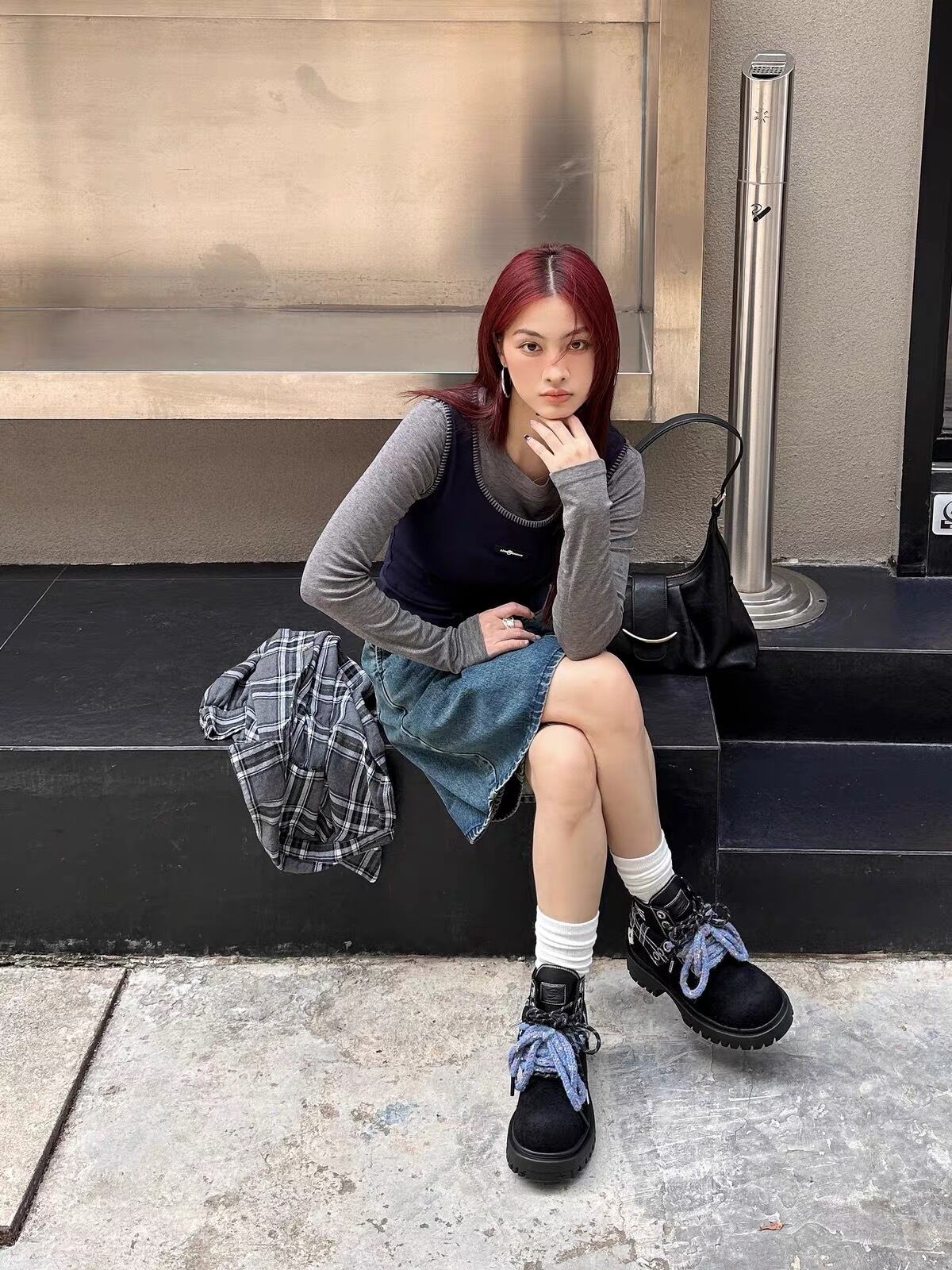 ティンバーランドのブーツのような無骨で重厚感のあるシルエットをベースに、ストラップデザインでエッジを効かせたミッドカットブーツ。ワークブーツ由来のタフさに、グランジやストリートの空気感を融合。デニムやカーゴ、ワイドパンツとも相性が良く、足元に存在感を与えてくれる一足。