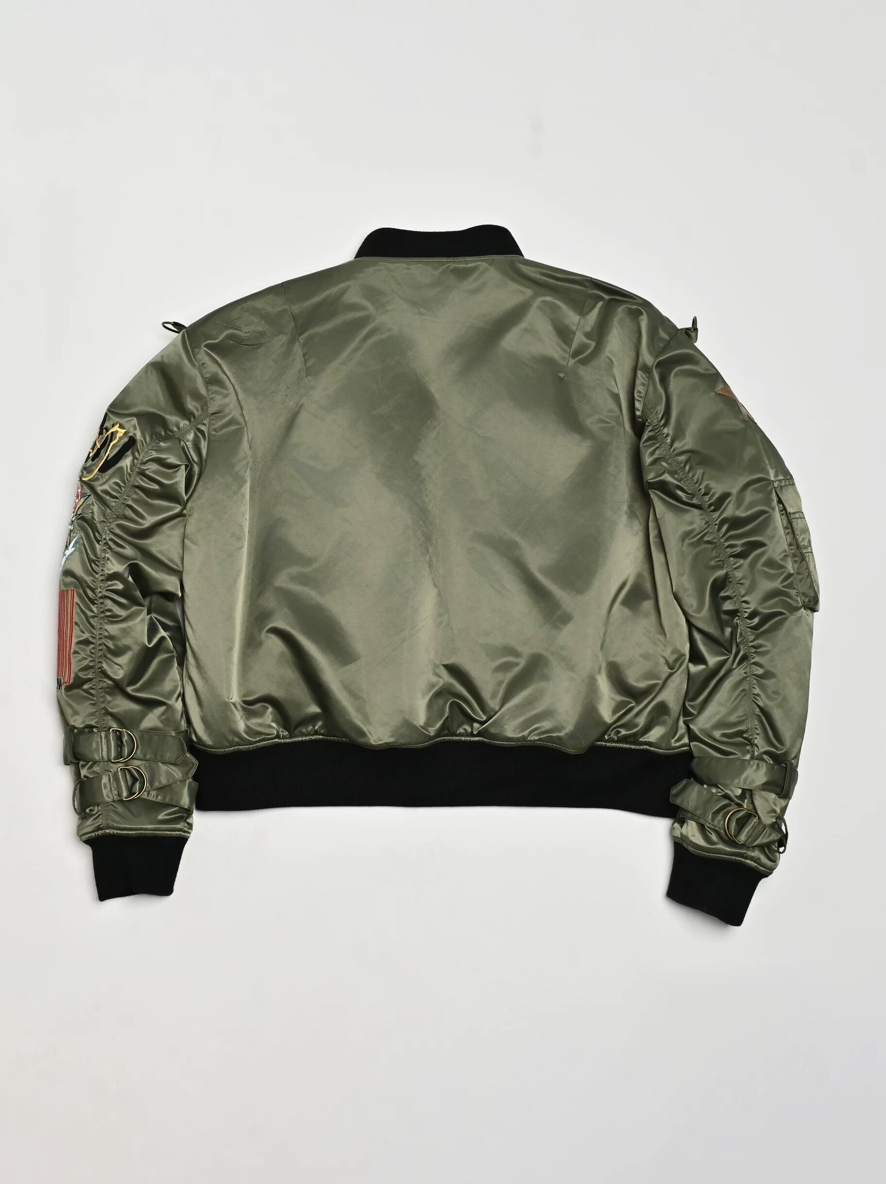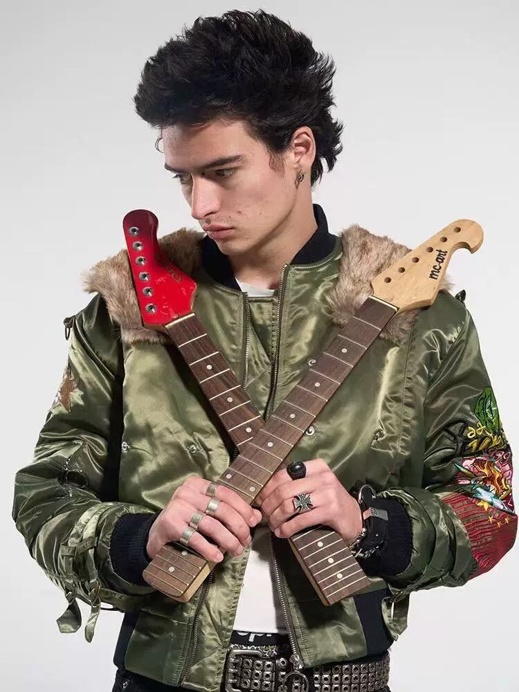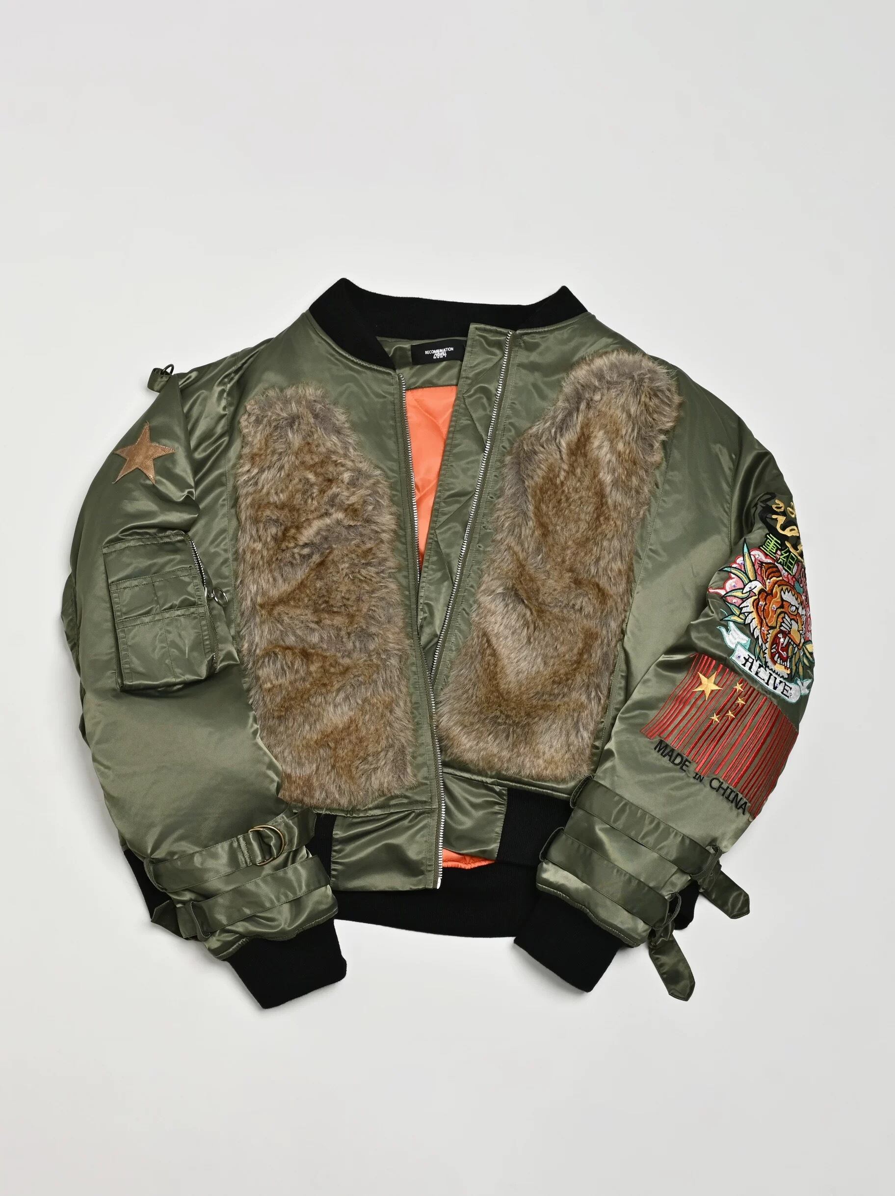 フロントに大胆に配置されたファーパネルと、随所に施されたクレイジーパッチが強烈な存在感を放つボンバージャケット。ミリタリー由来の無骨さに、異素材を掛け合わせた斬新なデザインが融合し、他にはない唯一無二の表情を生み出しています。着るだけでスタイリングの主役になる一着で、人と被らない個性を求める方にこそおすすめしたいアイテムです。