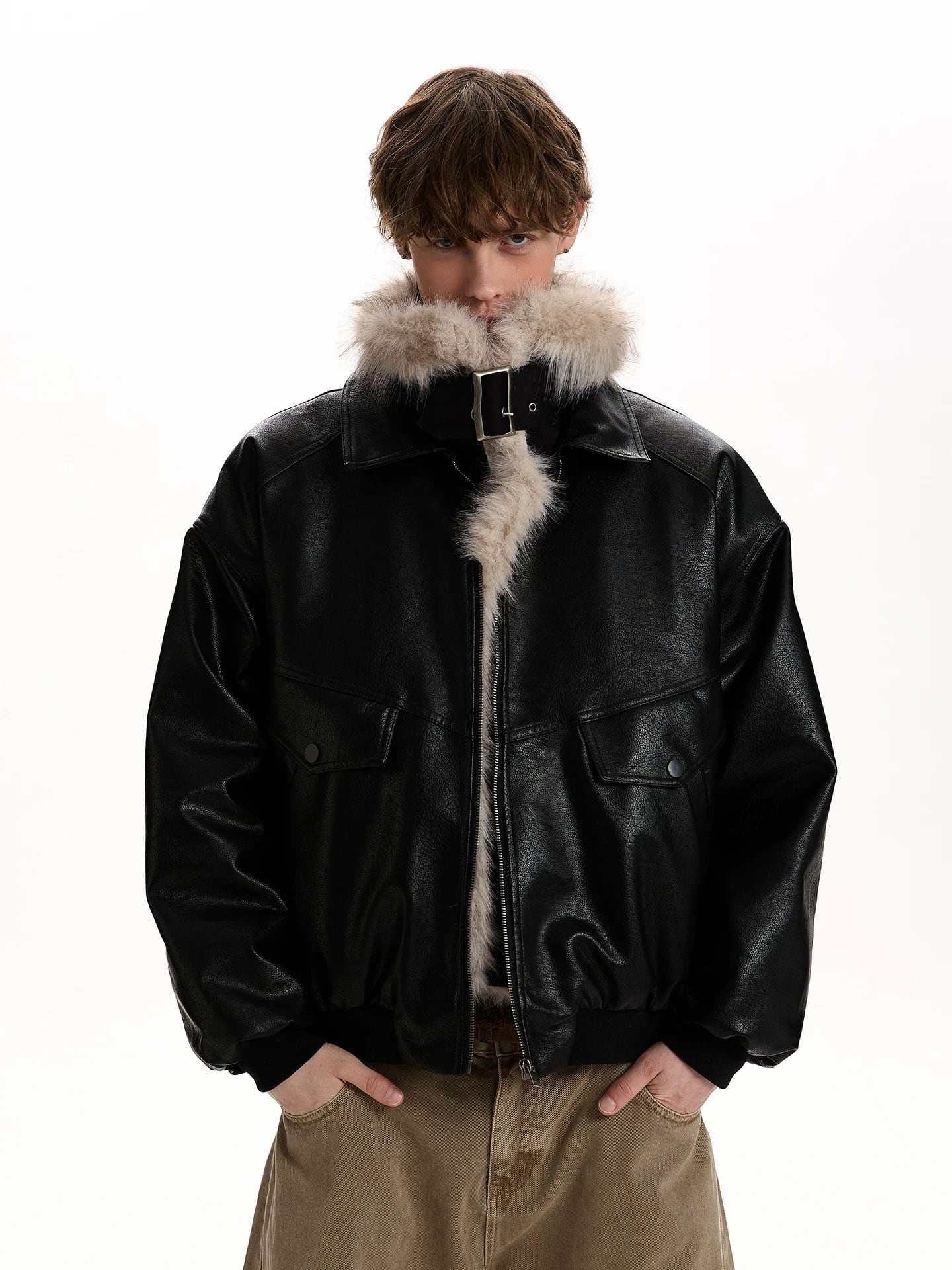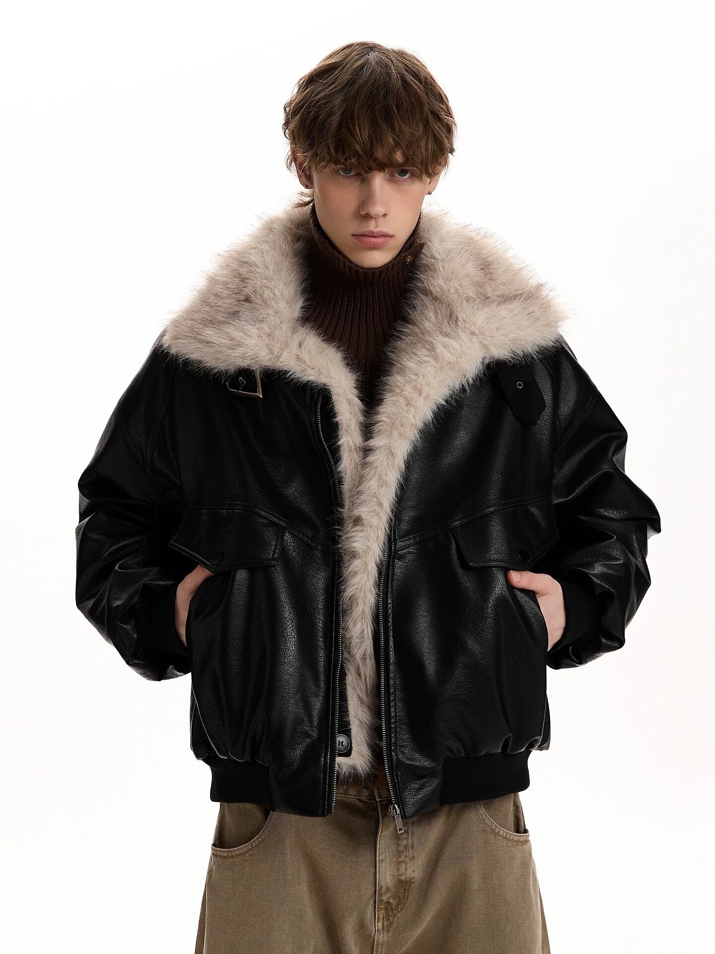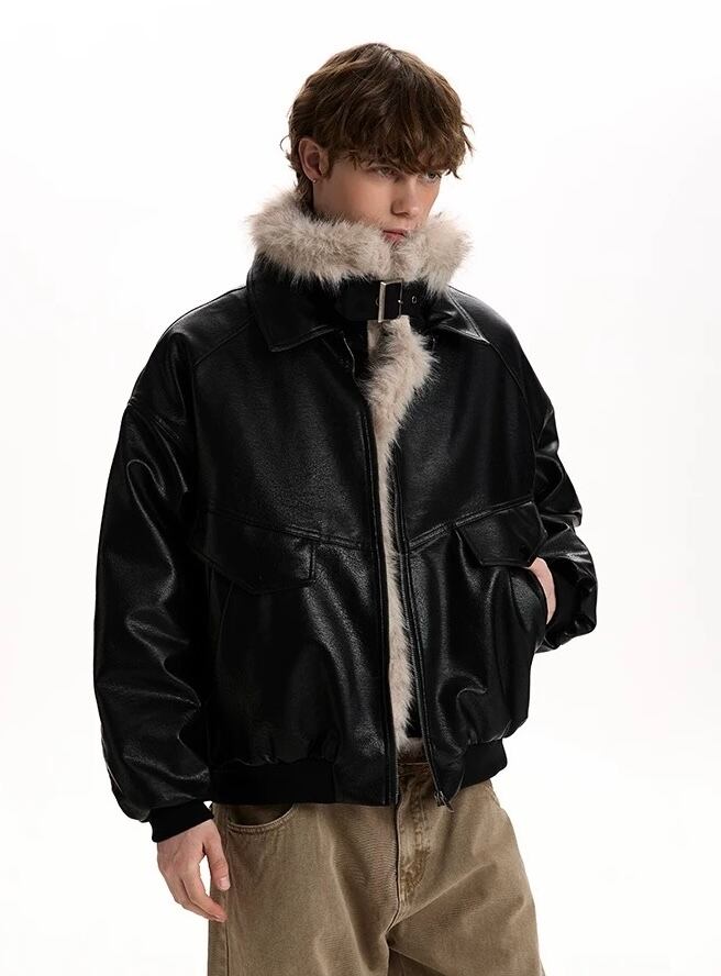 重厚なレザーに、存在感のあるファーカラーを組み合わせたフライトベースのレザーボンバージャケット。無骨なミリタリー由来のシルエットを軸に、グランジやopiumの空気感を落とし込むことで、ラフさとモード感を両立した一着に仕上げています。ワイドデニムやカーゴパンツとの相性も抜群。羽織るだけでコーデ全体に重心と迫力を与え、他と被らない主役級アウターとして活躍します。