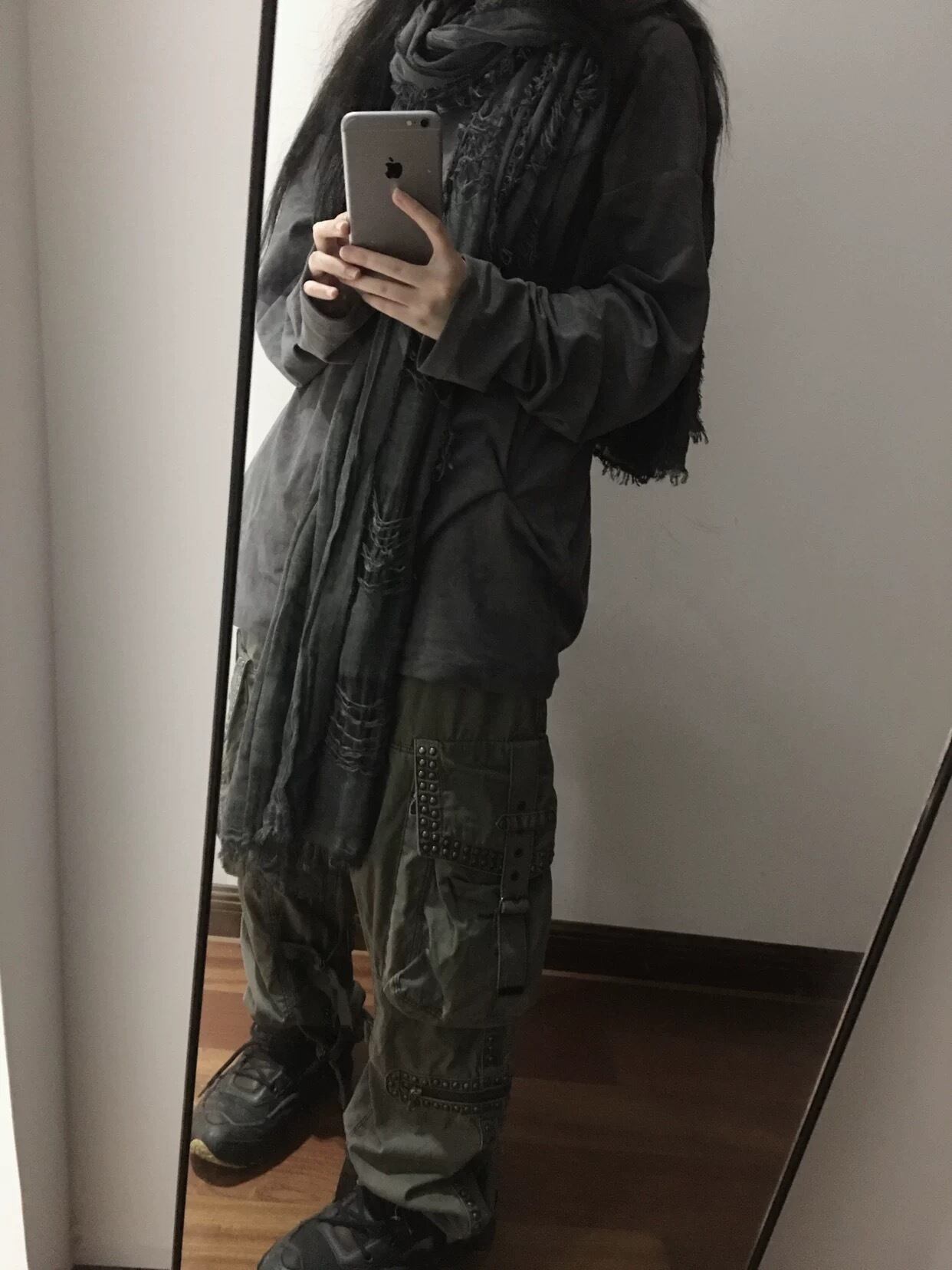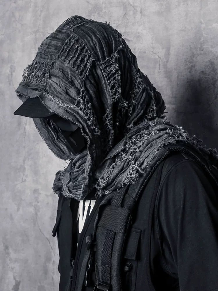 ダメージ加工が施されたマフラーで、バラクラバの要領で顔を覆うことができ防寒機能も備えられております。グランジ要素の強いアイテムで、デニムやスラックスなどと合わせて着用して奇妙なスタイリングを作ることができます。