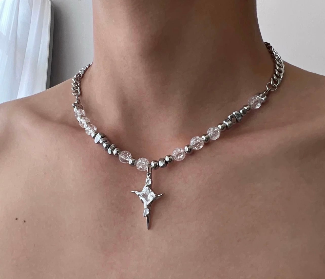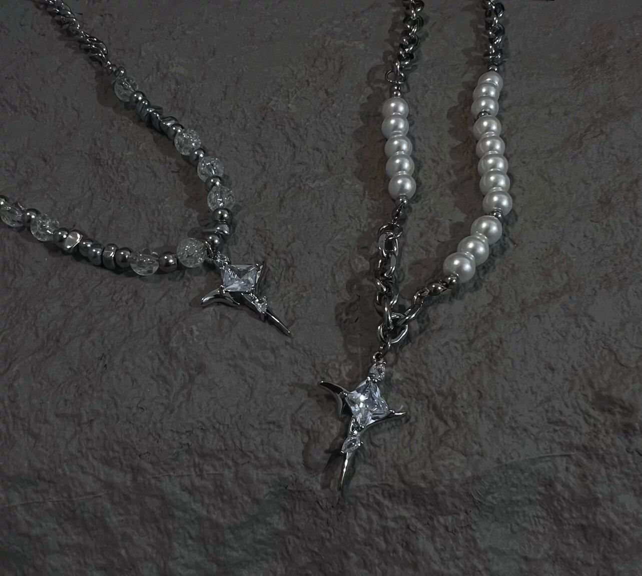 クラシックなパールと無機質なメタルチェーン、シャープなクロスモチーフを組み合わせたアシンメトリーデザインのネックレス。左右で異なる表情を持たせることで、甘さを抑えたモードな印象に仕上げています。首元に自然に沿うバランス設計で、単体でもレイヤードでも存在感を発揮。グランジ、opium、モードスタイルまで幅広く馴染み、ユニセックスで着用可能なアイテムです。