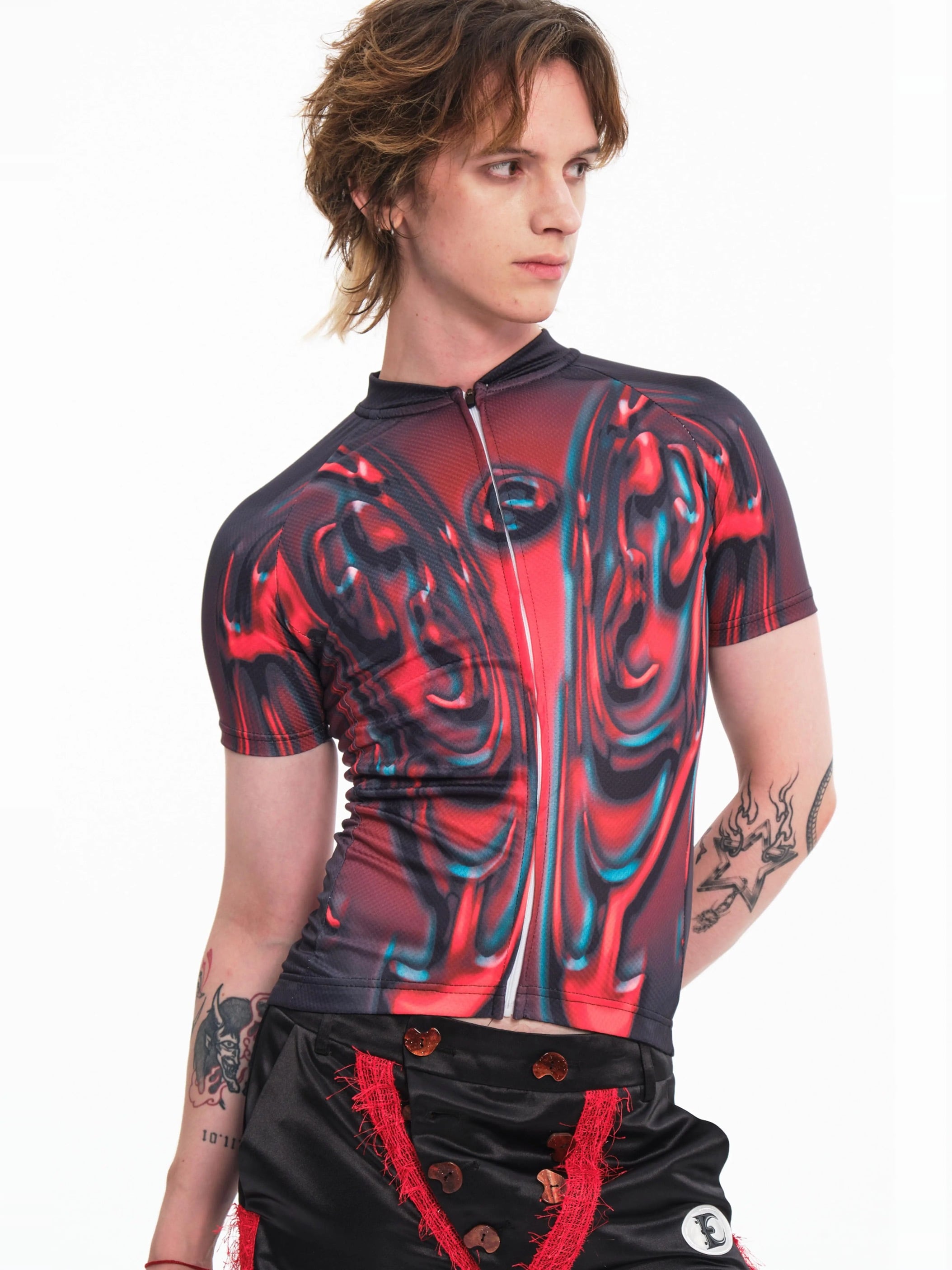 Embryo今季のアイテムで、人体構造を想起させる左右対称のバイオノイズ柄を全面に落とし込んだジップトップ。赤と黒を基調とした歪みのあるグラフィックが、サイバーとグランジの境界を横断する独特の存在感を演出します。身体に沿うタイトなシルエットはセカンドスキンのような感覚で着用でき、タトゥースキンのようにインナーとしてレイヤードも可能。テック系のアイテムや、デニム、スラックス全てのアイテムとも相性抜群です。