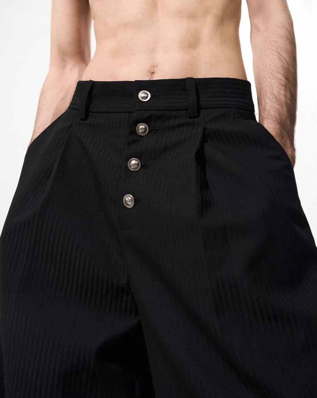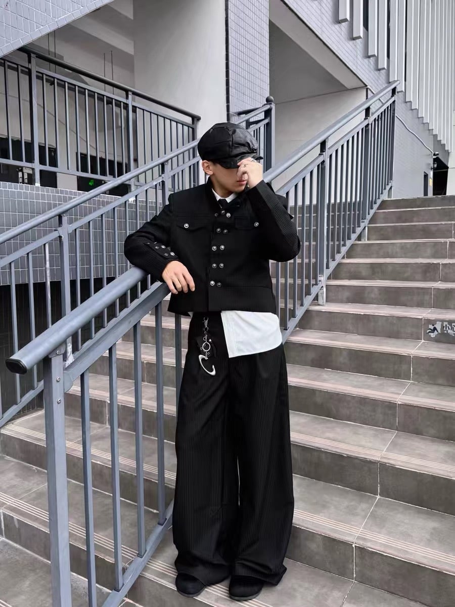 フロントに並ぶマルチボタンと、裾まで美しく落ちるワイドシルエットが印象的なスラックス。深いブラックと繊細なストライプが縦のラインを強調し、脚を長くシャープに見せてくれます。ミニマルでありながら構築的なデザインで、モードからストリートまで幅広く対応する一本。ユニセックスで着用でき、スタイリングに静かな緊張感と洗練を与えます。