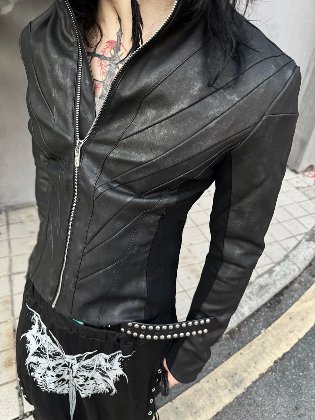身体のラインに沿って彫刻のように走る立体パネルが、ウエストを細く、肩と胸をシャープに見せるシルエット特化型のレザージャケット。セカンドスキンのようにフィットする柔らかなブラックレザーが、着るだけでスタイルを格上げし、モード・グランジ・ゴシックすべてにハマる万能な一着に仕上がっています。フロントジップを少し開ければタトゥーやインナーが映え、閉めればエッジの効いたミニマルなルックに変化。細身シルエットでアウターとしてもインナー使いも可能です。