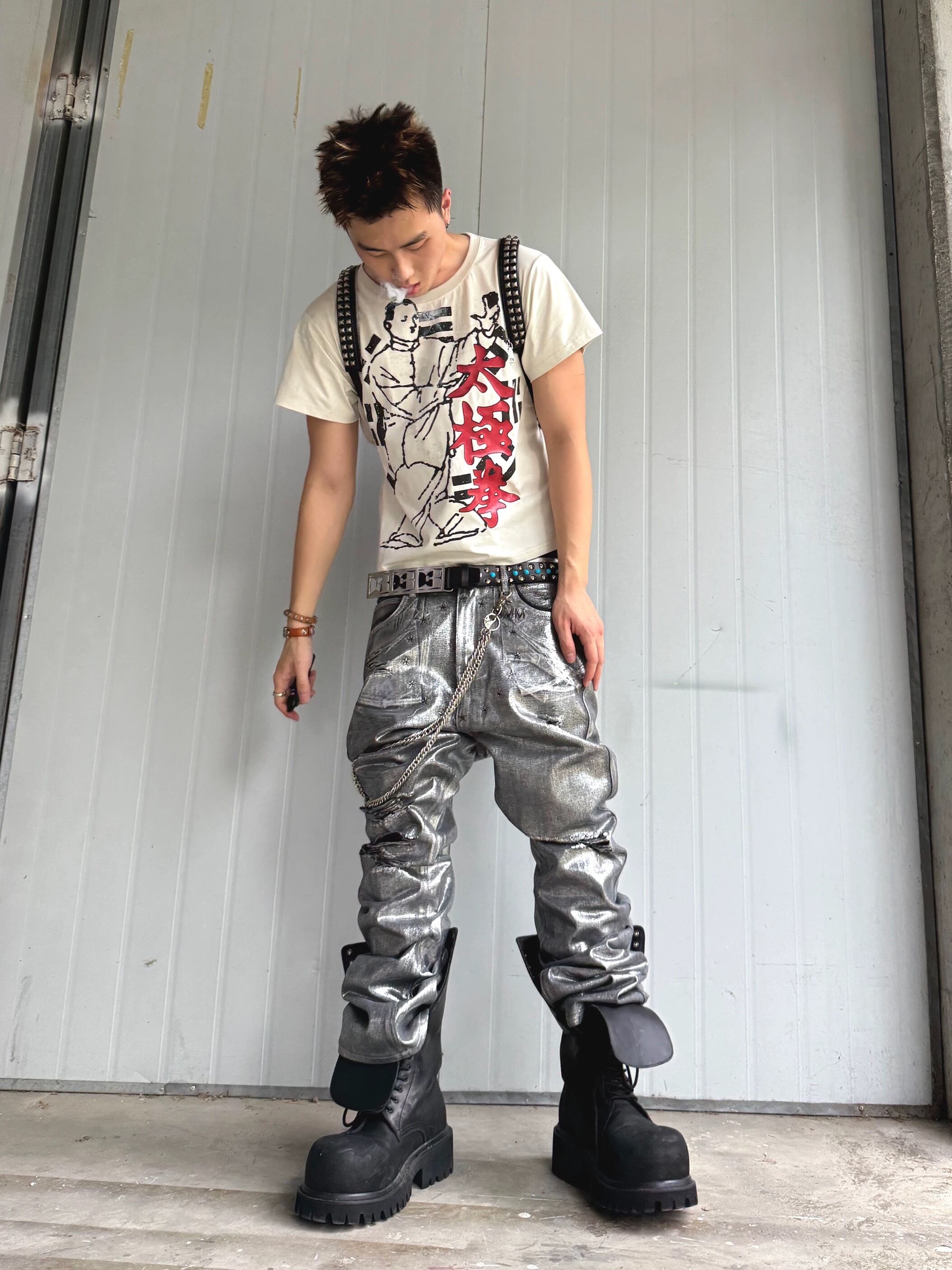溶けた金属のような鈍い光沢をまとった、存在感抜群のシルバーデニム。クローム調の加工により、角度によって表情が変わる立体的な質感が特徴です。バックポケット周りにはスターグラフィックが散りばめられ、無機質なシルバーの中にストリートのエッジをプラス。裾にかけてたっぷりと溜まるスタックシルエットが、ブーツの上で無骨に崩れ、1本でスタイリングの主役になる一本です。