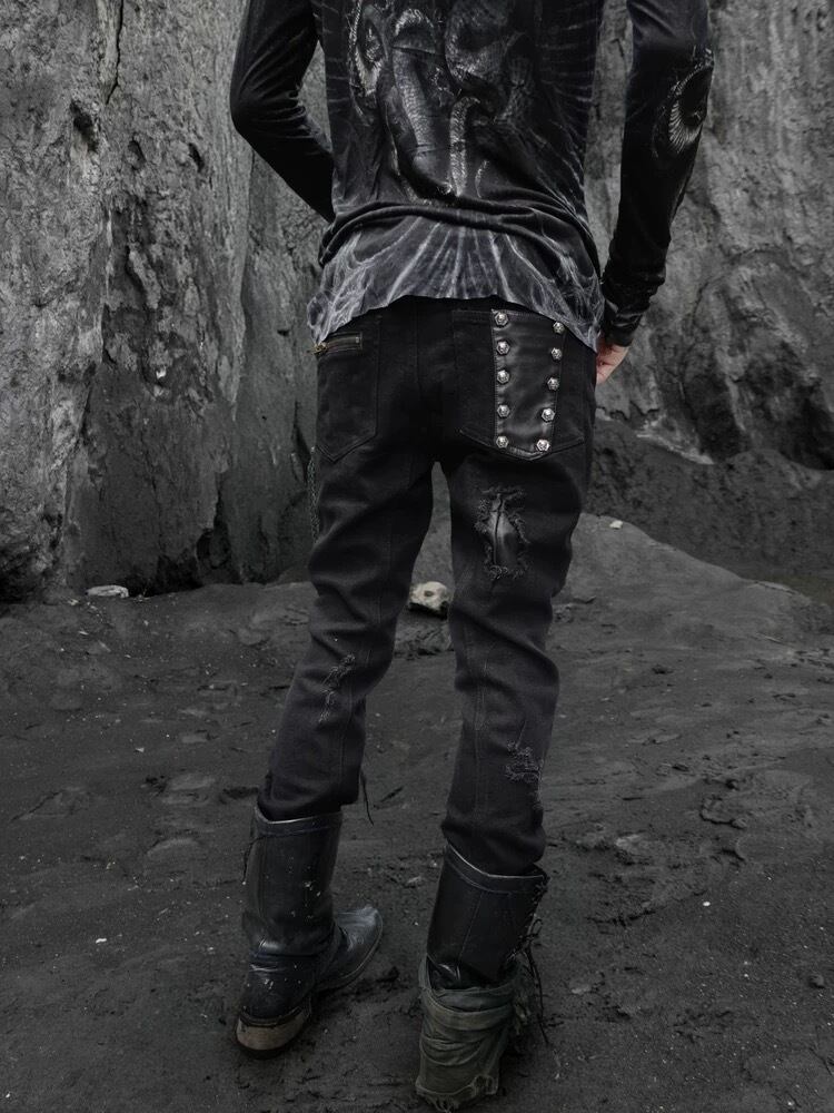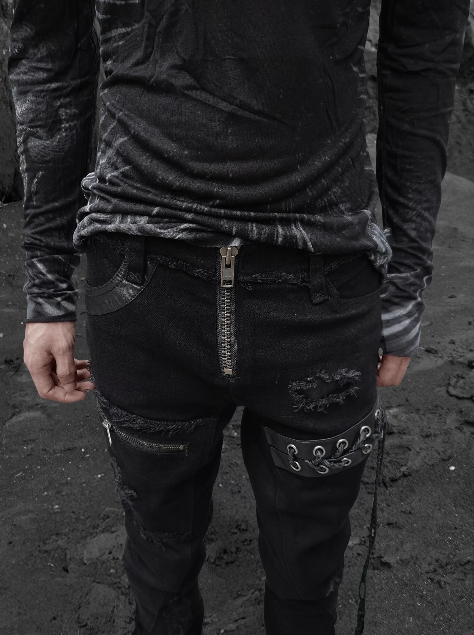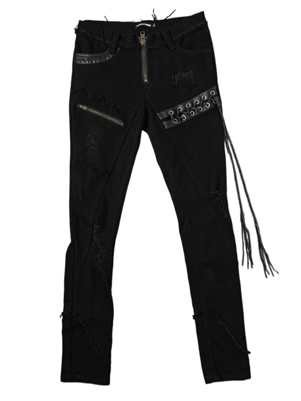 レースアップとボンテージディテールを融合させた、ゴシックかつインダストリアルな雰囲気を持つブラックデニム。メタルパーツとストラップ構造がRAF SIMONSの宗教期を彷彿とさせ、ダメージ加工とスリムなシルエットが身体のラインをシャープに演出します。ブーツインでも映える設計で、モードからグランジまで幅広いスタイルに対応する一本です。