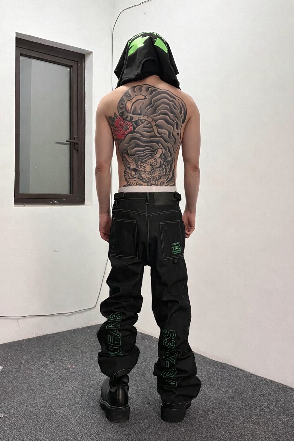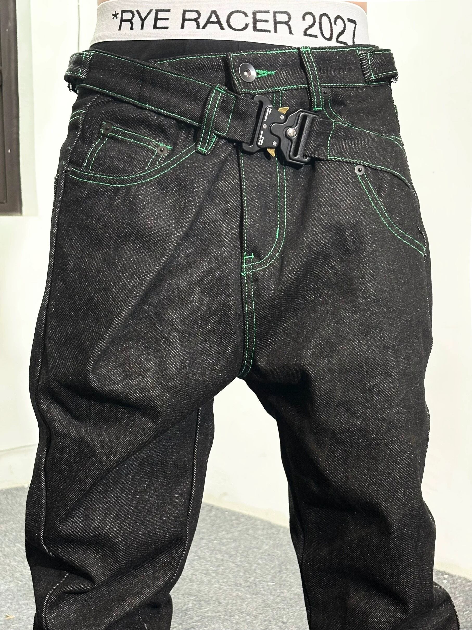ネオングリーンのステッチとバックルディテールが印象的なスタックデニム。ワイドなシルエットに長めのレングスを組み合わせ、ブーツの上に裾が溜まる立体的なラインを作り出します。グラフィックロンTやセカンドスキントップ、フーディ、レザージャケットと合わせやすく、Y2Kサイバーからダークストリート、モード寄りのスタイルまで幅広く対応。シンプルなトップスでもコーディネートにエッジを加えられる一本です。