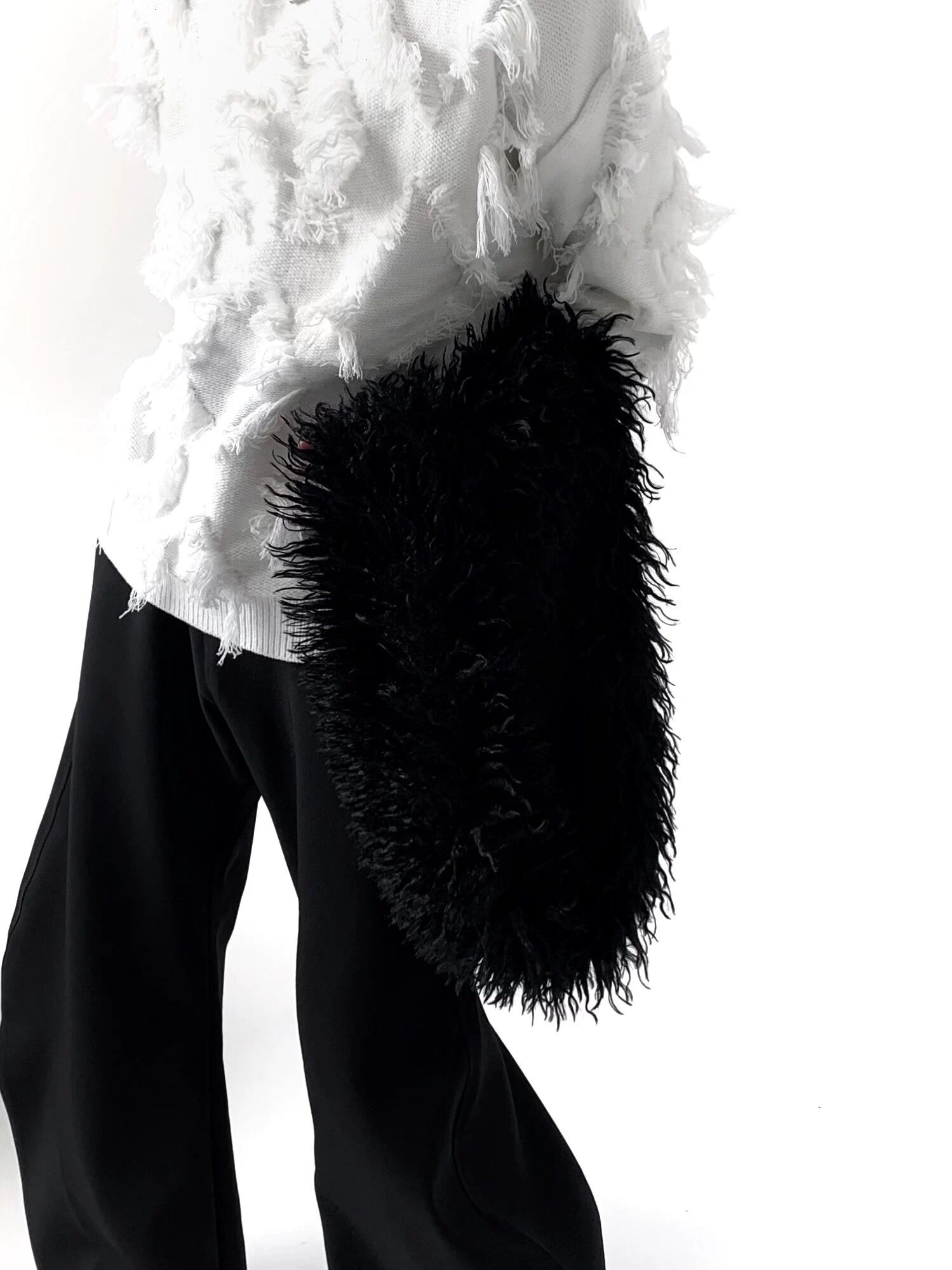漆黒のシャギーファーが印象的なロングストールで、首元から流れるシルエットがダークでラグジュアリーな奥行きを演出し、RAF SIMONSやRick Owensを思わせるモード×ゴシックの空気感を羽織るだけで完成させる、コートやレザージャケットの上から合わせるだけでスタイリングに強い存在感を与える、ユニセックスでコーデを主役級に引き上げる一本です。