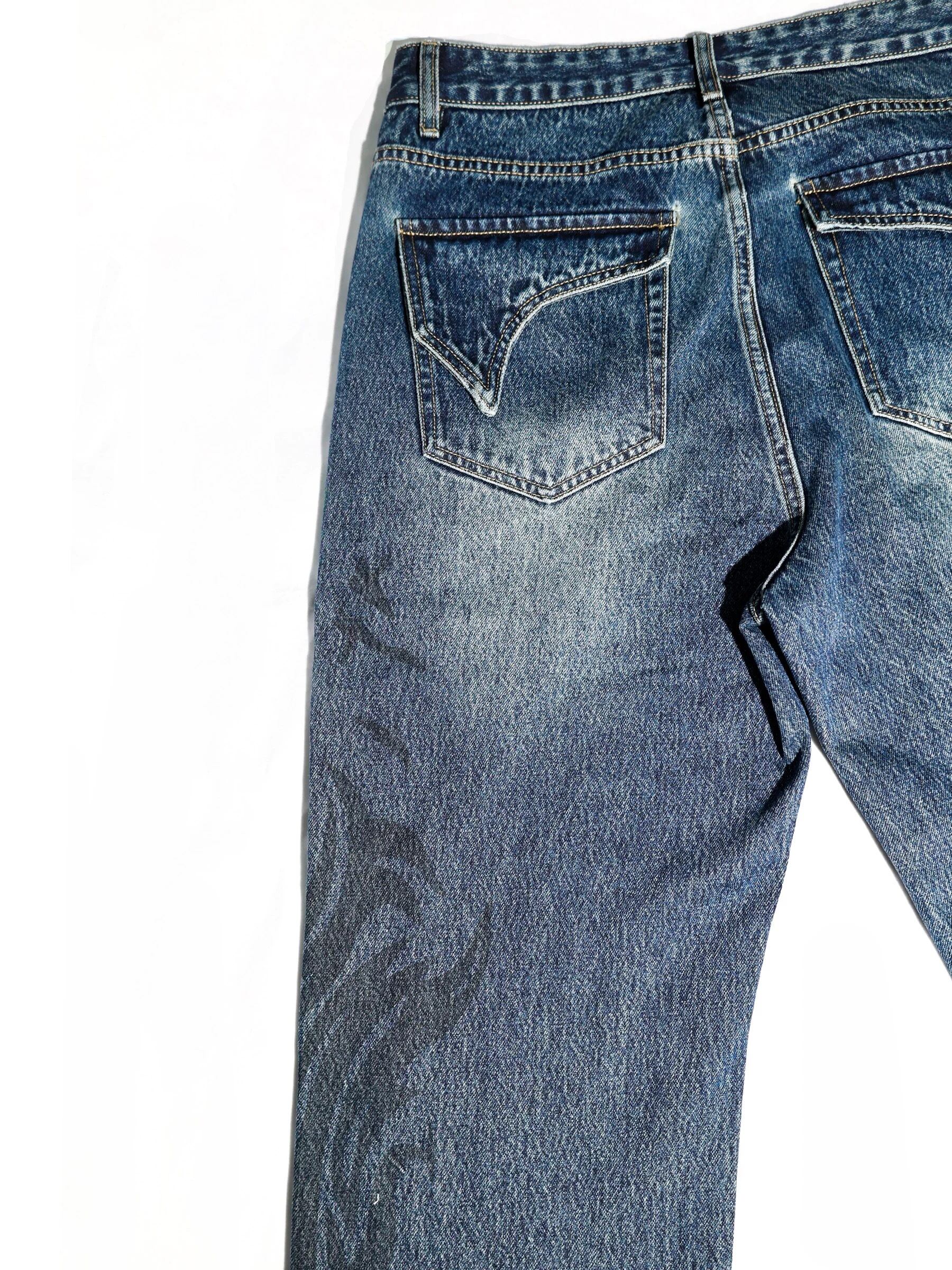 両脚に大きく広がるゴールドイーグルが圧倒的な存在感を放つヴィンテージデニム。まるで翼を広げて獲物を掴みにかかる瞬間を切り取ったようなグラフィックで、90sバイカーカルチャーとタトゥーアートの空気を色濃く感じさせる一本です。フェードしたインディゴにゴールドプリントが浮かび上がり、ラフシモンズやY2Kグランジ、アーカイブ系スタイルとも相性抜群。シンプルなトップスに合わせるだけでコーディネートの主役になる、まさに“履くアートピース”のようなデニムです。