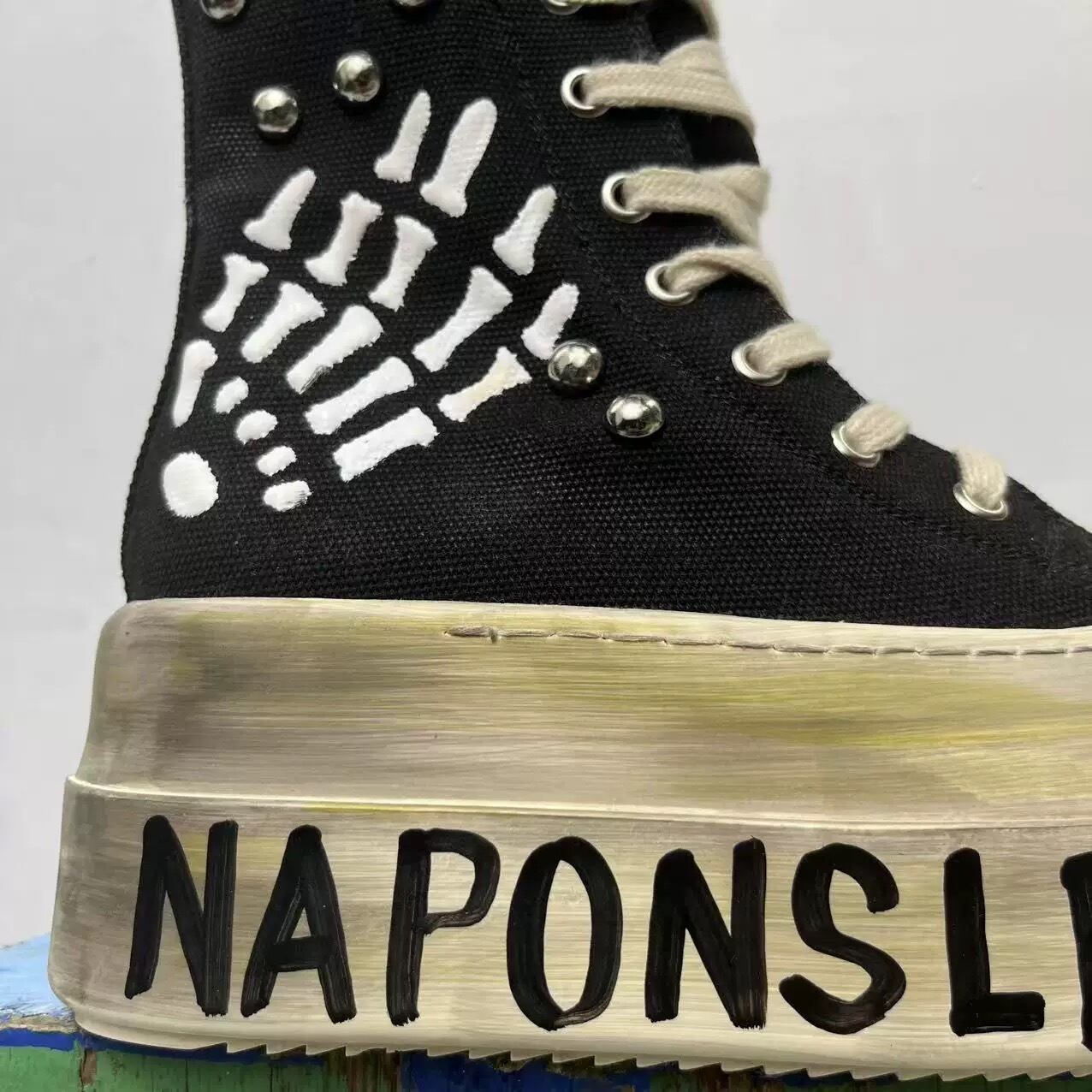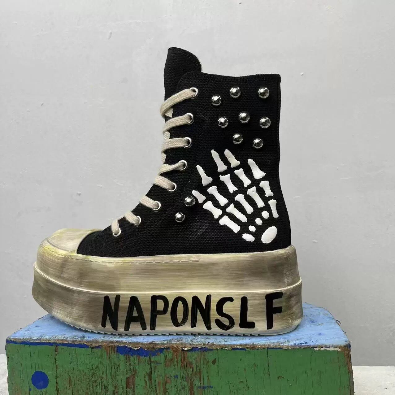 圧倒的なボリュームを誇るダッドソールに、スケルトンハンドのグラフィックとリベット装飾を融合させた存在感抜群のプラットフォームスニーカー。