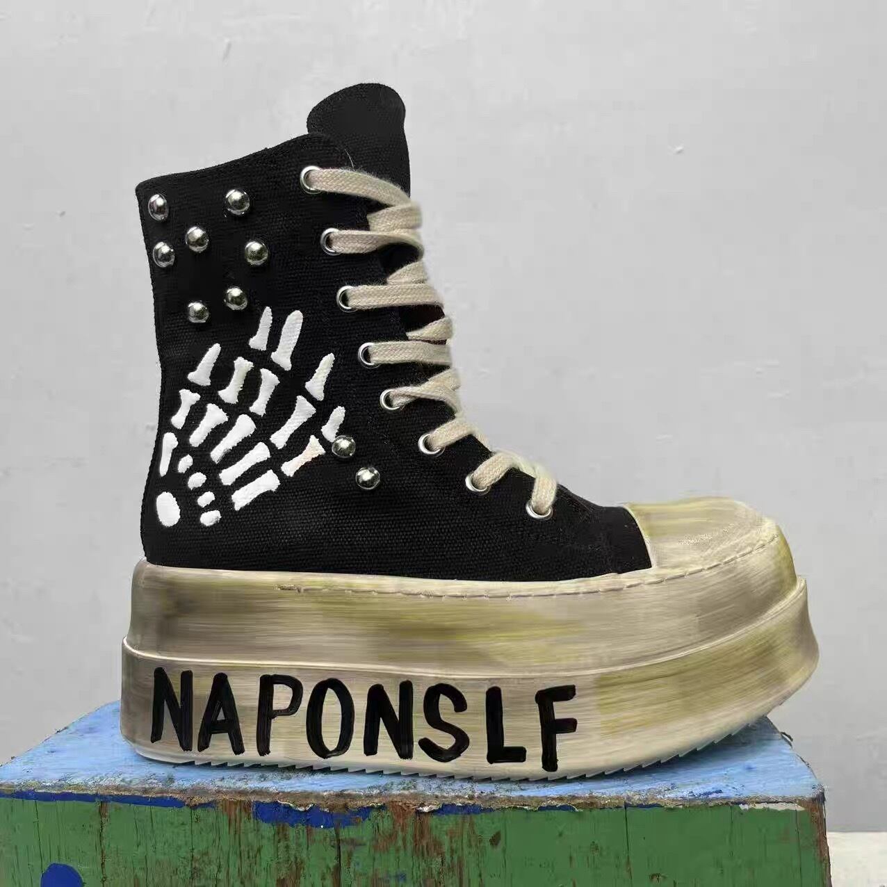 Balenciaga や Rick Owens を思わせるハイモードな厚底シルエットに、グランジとパンクのエッジをプラスし、履くだけでスタイリングの主役になる一足です。サイドジップ仕様で着脱もしやすく、ストリートからモードまで幅広く対応。Y2K ダッドスニーカー・厚底スニーカーを探している人に刺さる、唯一無二のデザインです。
