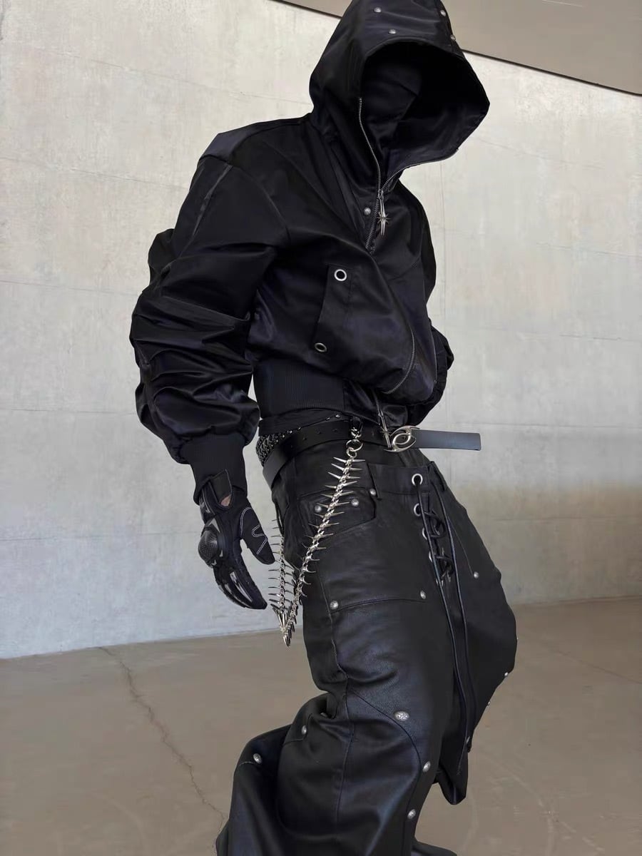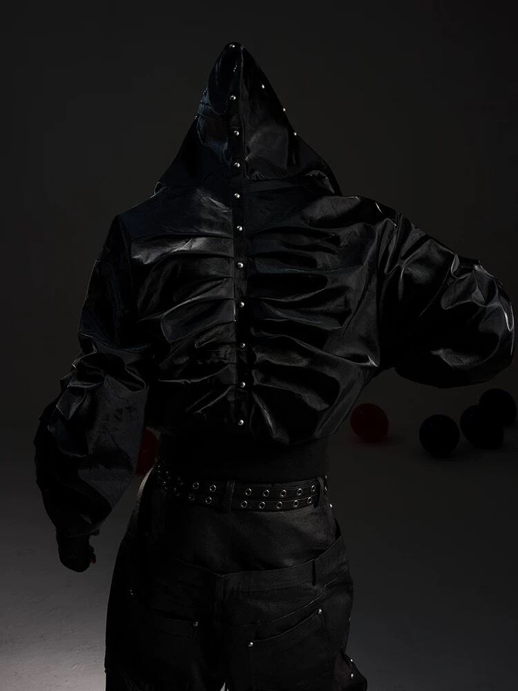 背中に走るリベットと立体的なルーシングが“脊椎”のようなラインを生み出す、テック×ゴシックのフーデッドジャケット。光沢感のあるブラックシェルが身体の動きに合わせて陰影を作り、着るだけでシルエットに異形の存在感を与える一着。フレアレザーやワイドデニム、チェーン付きパンツと合わせることでポストアポカリプスやダークストリート、グランジ寄りのスタイルに強烈な軸を作れる。