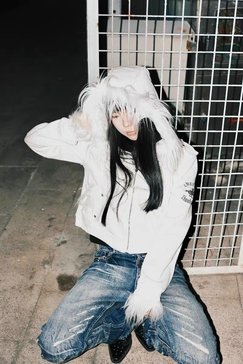 Y2Kムードを限界まで引き上げた存在感抜群のファーフーディ。顔周りを覆うボリュームファーとタイトなボディバランスが、スタイル全体を一気にダークでエッジィな印象に引き上げる。スタッズデニムやローライズ、ブーツと合わせればY2K・グランジ・サイバー系スタイルが即完成し、シンプルなインナーの上から羽織るだけでも主役級の一着。
