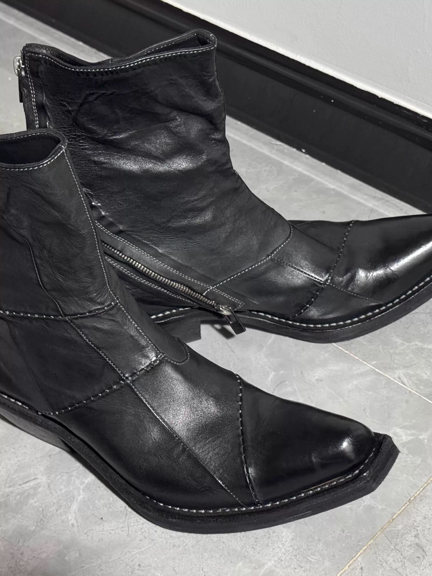 深みのあるブラックレザーとサイドジップ仕様が無骨さと洗練を両立させたヒールブーツで、履き込まれたような質感が足元に重厚な存在感を与える一足。程よく高さのあるヒールとシャープなトゥが脚のラインを美しく見せ、ワイドデニムやフレアパンツ、スラックスとの相性も抜群。グランジやダークモード、Y2Kスタイルに自然に溶け込み、コーディネート全体を引き締める主役級のブーツ。