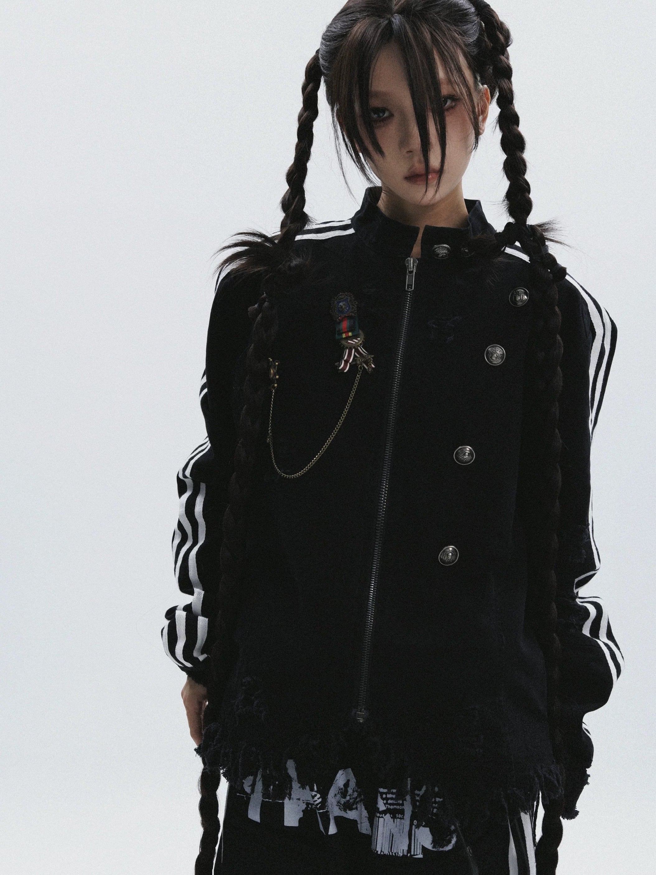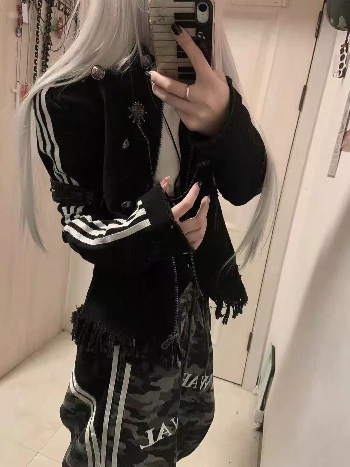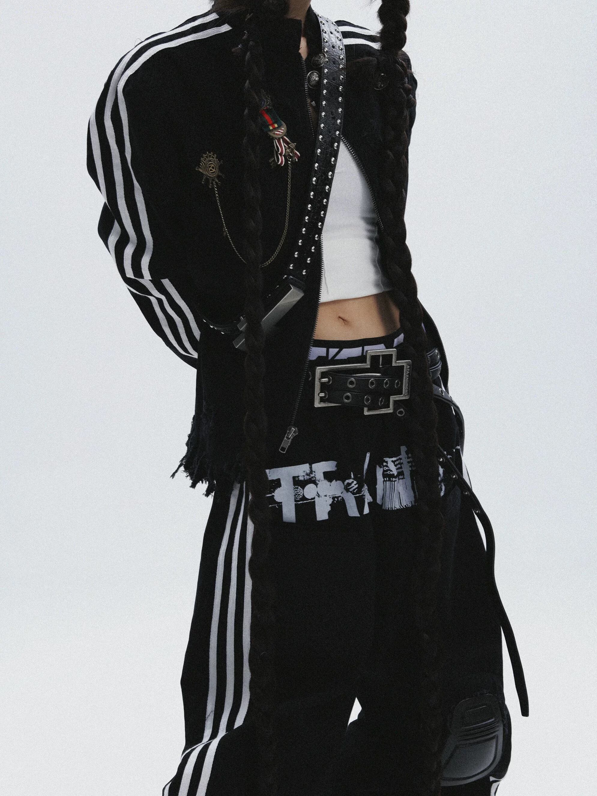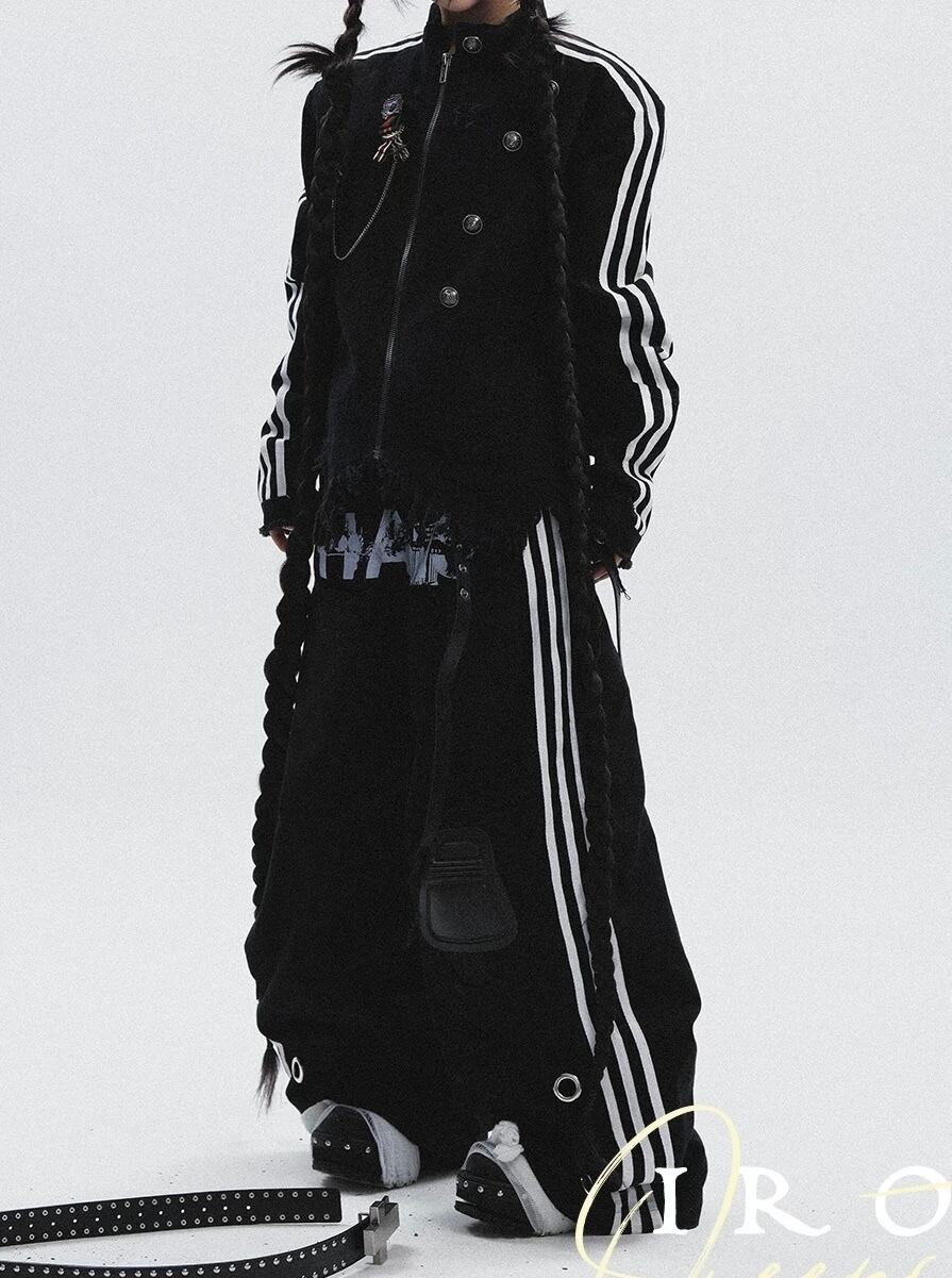 クラシックなトラックジャケットをベースに、スタッズ付きストラップディテールでエッジやクラッシュ加工が施されたデザイン。スポーティーなシルエットにインダストリアルな要素を重ねることで、Y2Kやダークストリートの空気感を自然に取り込んでいる。ワイドトラックパンツやカーゴパンツ、ジップデニムと相性が良く、ストリート・Y2K・グランジテイストとの融合性が高い一着。インナー次第で軽い羽織としても主役としても使え、スタイリング全体の完成度を引き上げてくれる。