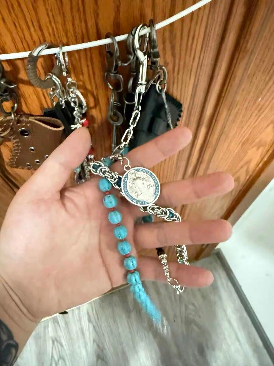 シルバーチェーンとターコイズビーズ、コインモチーフを組み合わせたウォレットチェーン。インディアンジュエリーを彷彿とさせるスピリチュアルで土臭い雰囲気がありつつ、ストリートやグランジ、ロックスタイルにも自然に落とし込める一本。デニムやレザーパンツとの相性が良く、シンプルなコーディネートに奥行きと存在感を加えてくれるアクセントアイテム。