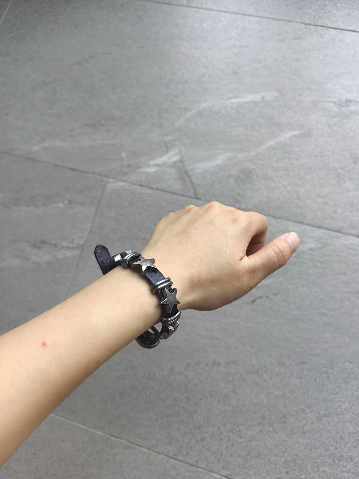 ブラックレザーに無骨なシルバースターを配した、グランジ要素の強いレザーバングル。使い込んだようなロック感とパンクの荒さを併せ持ち、手元に退廃的な存在感を与える一本。ワイドデニムやダメージデニム、レザージャケット、ライダース、ボンテージパンツとの相性が良く、Y2K・グランジ・ロック・パンク・ストリート系スタイルのアクセントとして活躍する。