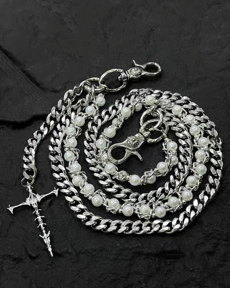 重厚感のあるシルバーチェーンに、パールチェーンとクロスモチーフを組み合わせたダブル仕様のウォレットチェーン。無骨さと上品さが共存するデザインで、腰元に自然なレイヤード感と存在感を演出します。ワイドデニムやサグデニム、レザーパンツとの相性が良く、グランジ・Y2K・ダークストリートなど幅広いスタイルに取り入れやすい一本です。