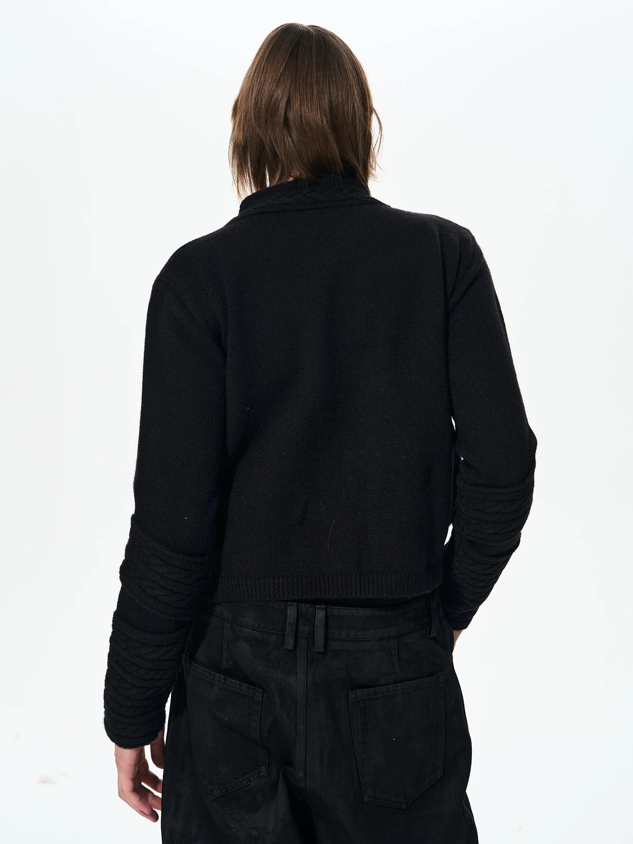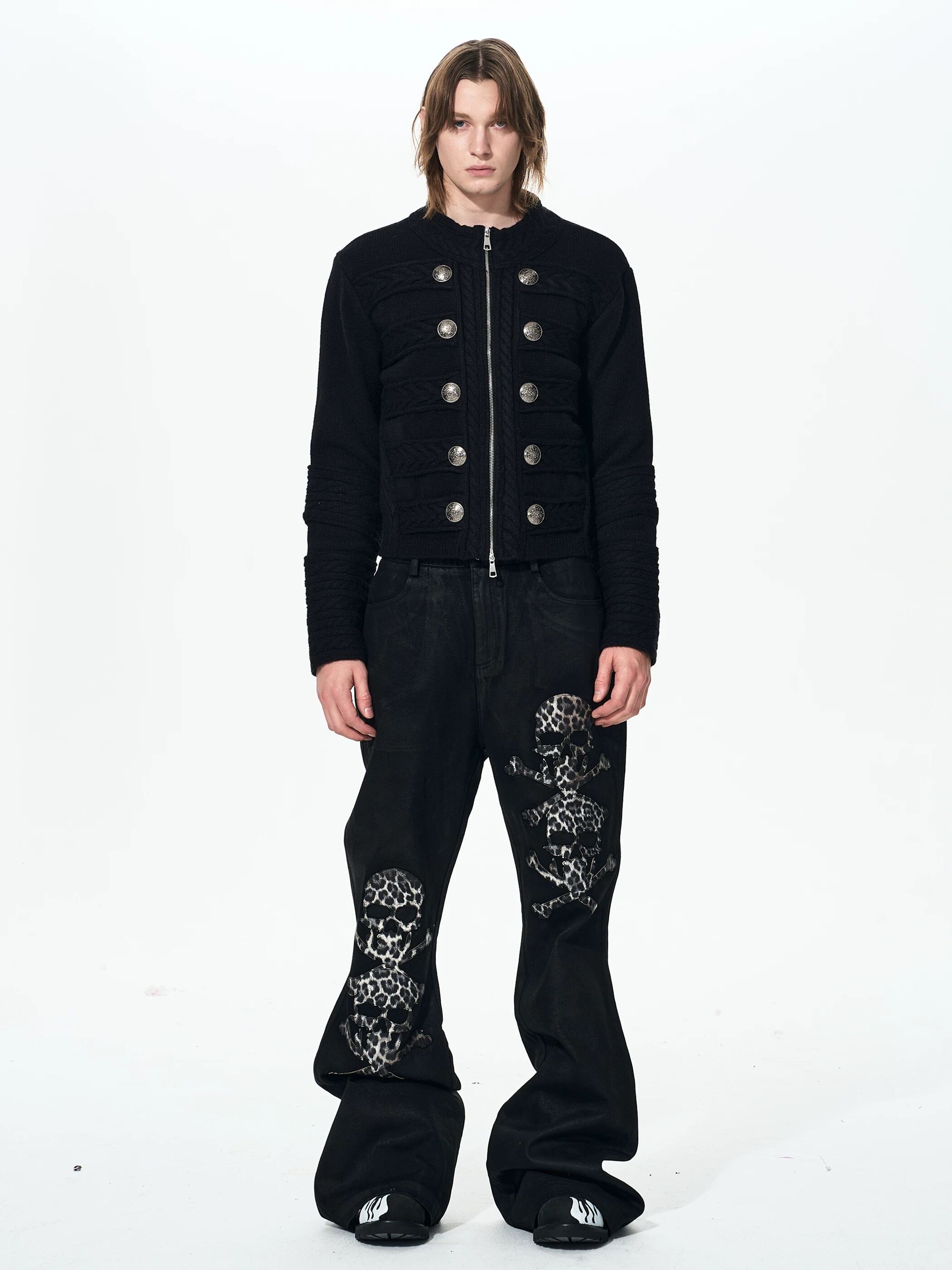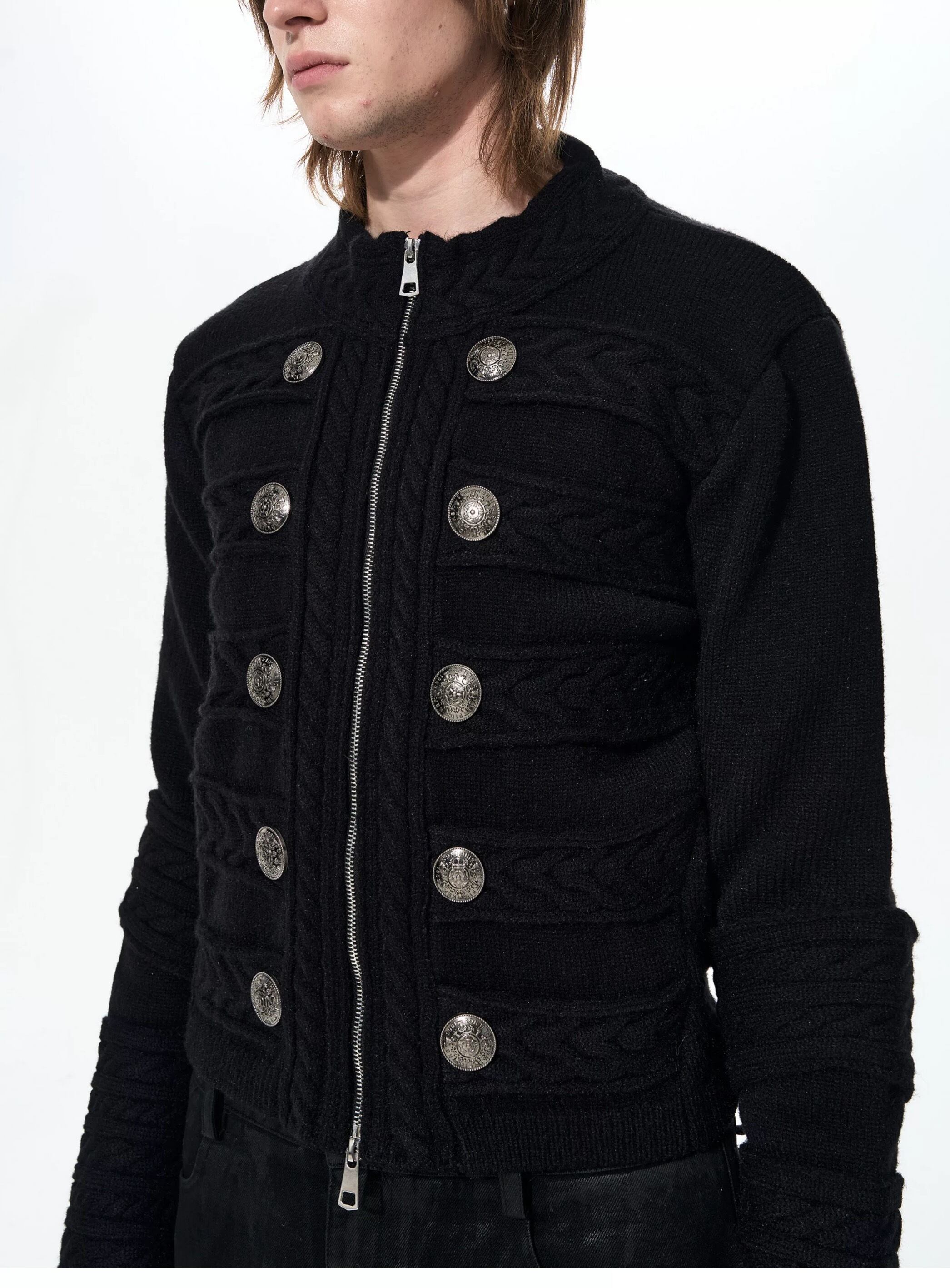 軍服由来のナポレオンジャケットをニット素材で再構築した、重厚さと柔らかさを併せ持つ一着。整然と並ぶメタルボタンと縦のラインを強調するフロントデザインが、羽織るだけでスタイリングに緊張感と品格を与えます。デニムやスラックス、レザーパンツと好相性で、ミリタリー、ゴシック、モード、グランジまで幅広いジャンルに対応し、アウター感覚でもインナー使いでも存在感を発揮するアイテムです。