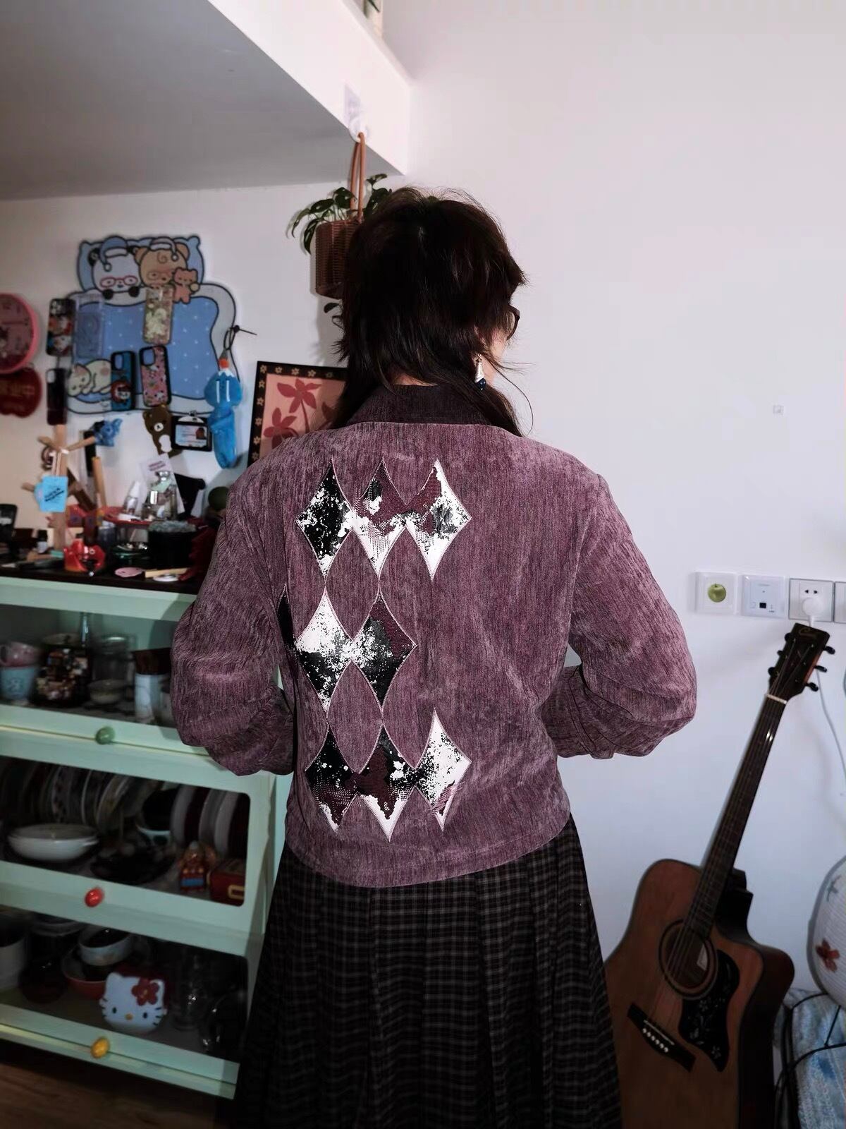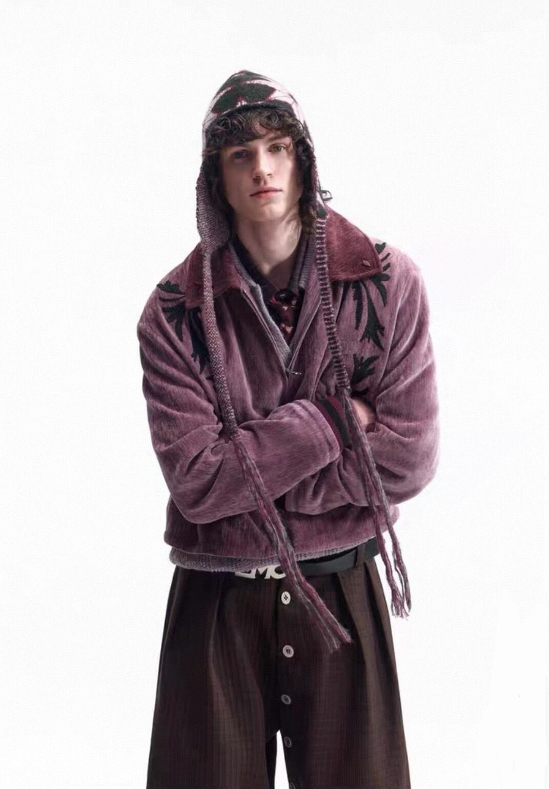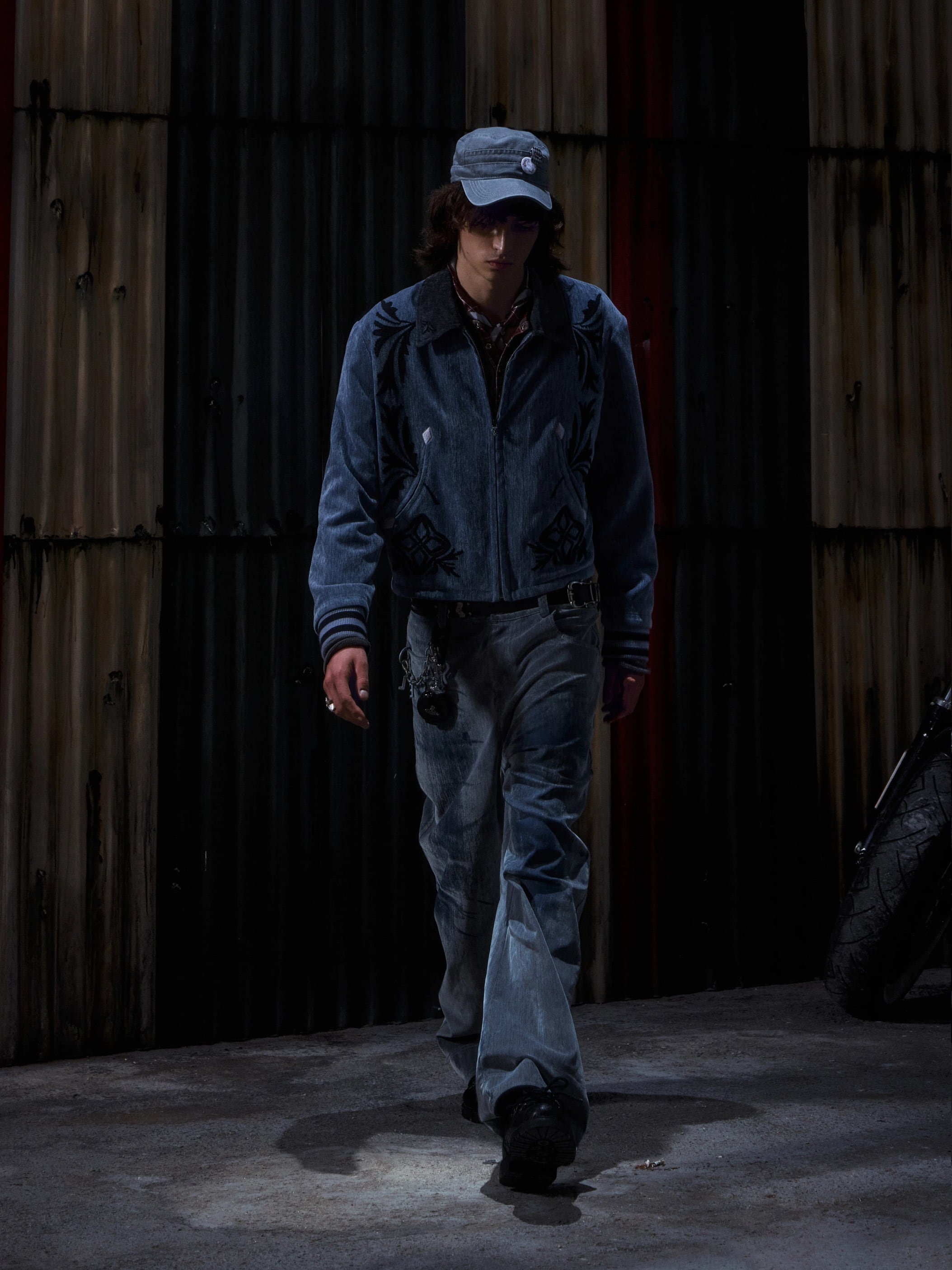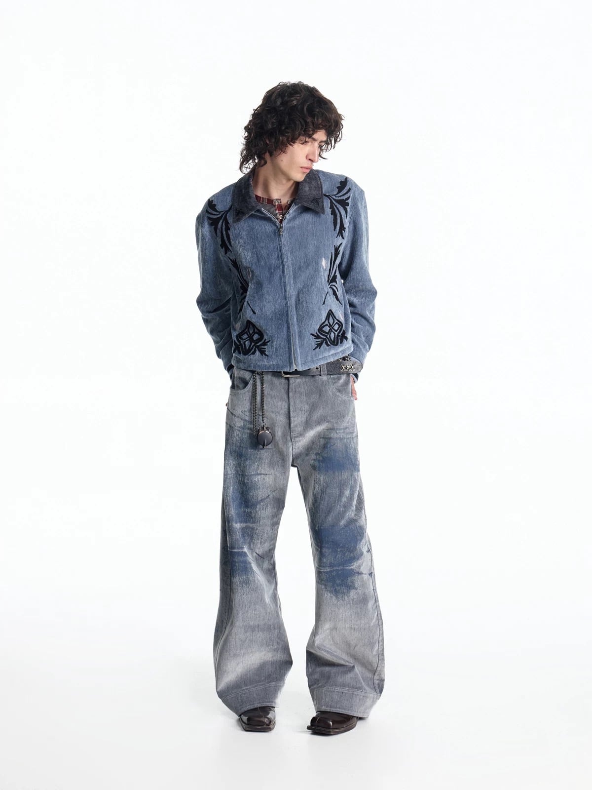 アメリカのファーマーズジャケットを着想源に、実用服としての無骨さと装飾性を融合させたジップジャケット。ワーク由来のボックスシルエットと短丈のバランスが、全体に程よい緊張感と現代的な印象を与える。随所に施された刺繍は、民藝的な素朴さを感じさせながらも、どこか退廃的でモードな表情を演出。シャツやニット、フーディなどインナー次第で幅広いレイヤードが楽しめ、ワイドスラックスやデニムとも好相性。グランジやネオヴィンテージ、モードスタイルに自然に馴染むブルゾンジャケット。
