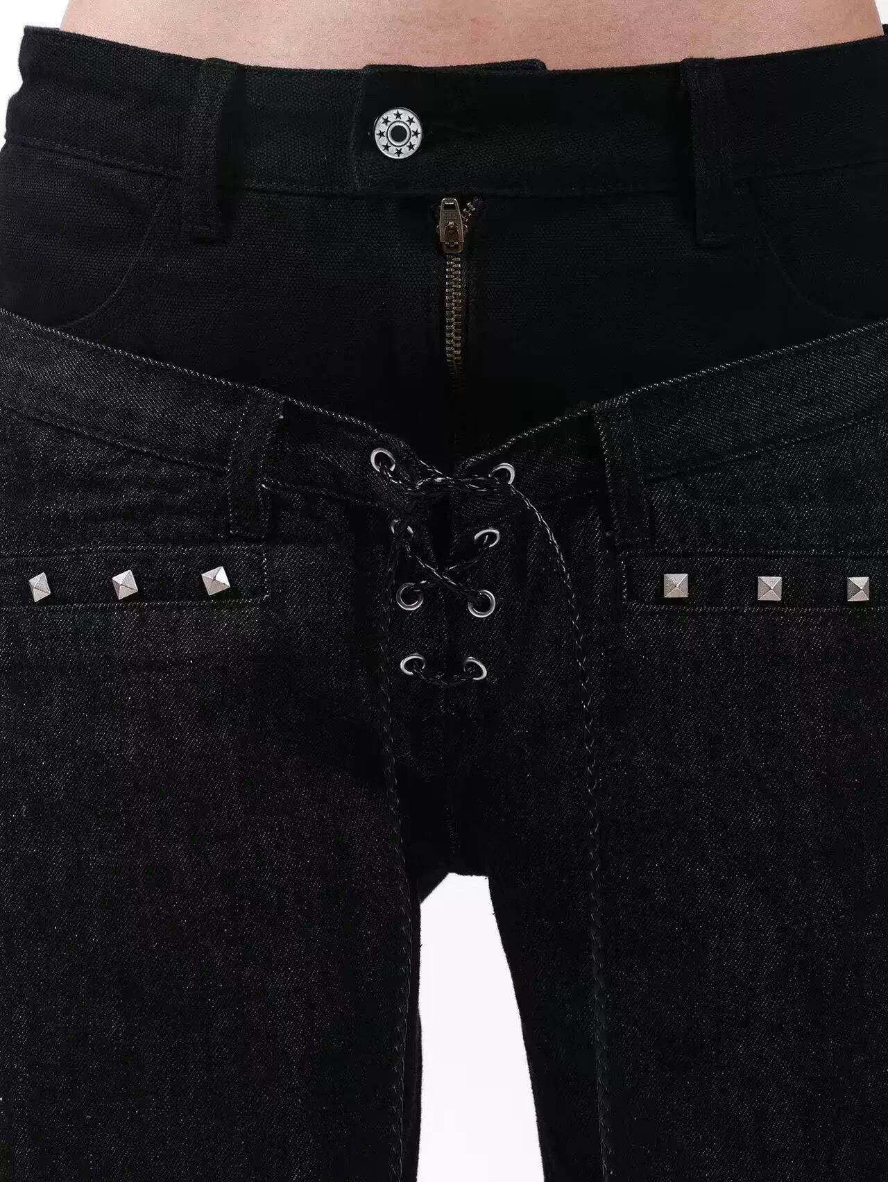 腰位置を落としたサグシルエットに、フロントからバックにかけて配置されたレースアップディテールが印象的な一本。スタッズの直線的な配置がパンクやグランジの文脈を感じさせつつ、全体はブラックデニムで統一されているため、過度に主張せずスタイリングに自然に溶け込む。グランジ、Y2K、パンク、アナーキー系のスタイルと相性が良く、クロップドトップスやタイトなフーディ、レザージャケット、ショート丈アウターと合わせることで、腰回りのデザインが際立つ。