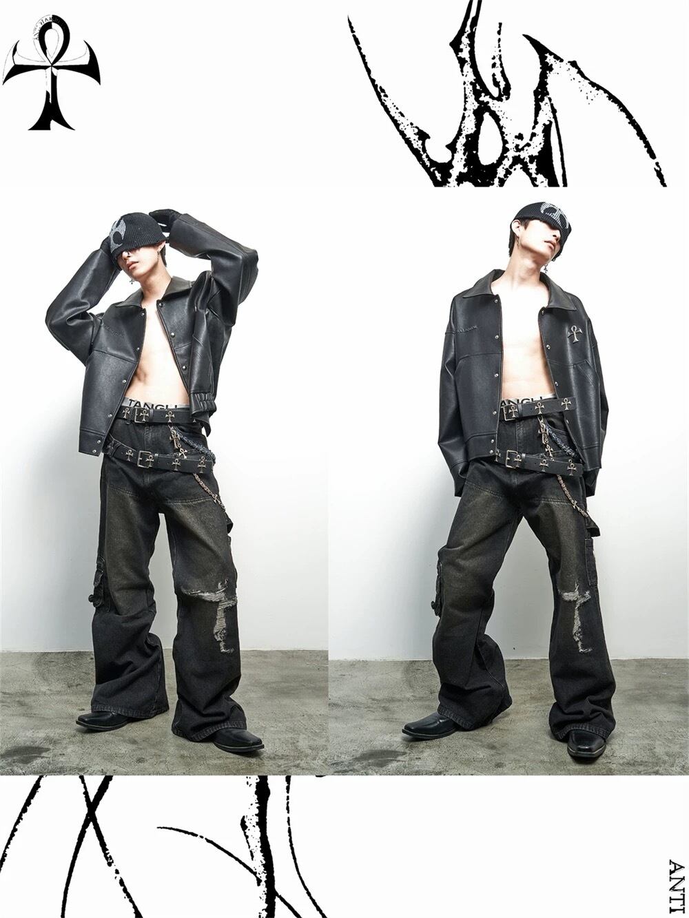 膝から裾にかけて緩やかに広がるフレアシルエットに、クラッシュ加工と十字架モチーフを落とし込んだデニムパンツ。使い込まれたようなブラックデニムの風合いが退廃的なムードを強調し、十字架の装飾がパンクやゴシック、グランジの文脈を自然に想起させる。グランジ、Y2K、ゴシック、アナーキー系のスタイルと相性が良く、クロップドトップスやタイトなトップス、レザージャケット、ライダースなどと合わせることで、シルエットとモチーフの存在感が際立つ一本。