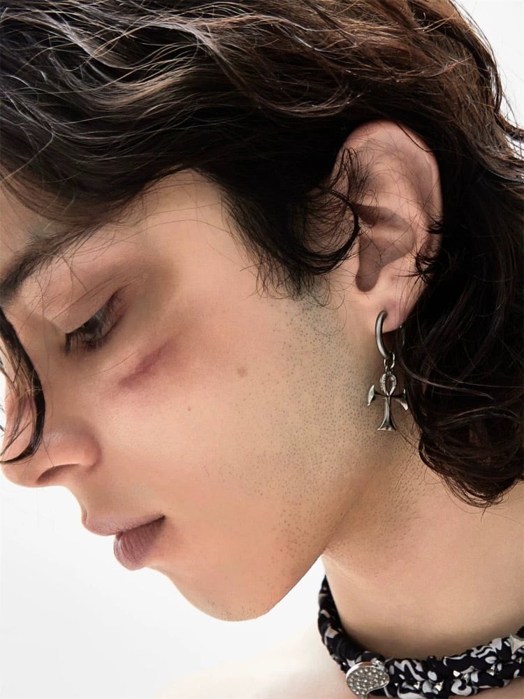 邪悪な存在感を放つ、アンククロスモチーフを落とし込んだフープピアス。宗教的モチーフでありながらも過度な主張を抑え、スタイリングに自然に溶け込むデザインに仕上げられている。素材にはチタン鋼を使用しており、金属アレルギーが出にくく、デイリーでも取り入れやすいのが特徴。クロムハーツを彷彿とさせる重厚感のあるシルバーの輝きが、グランジ、ゴシック、Y2K、パンクスタイルに相性良く、レザージャケットやブラックコーデのアクセントとして存在感を放つアイテム。