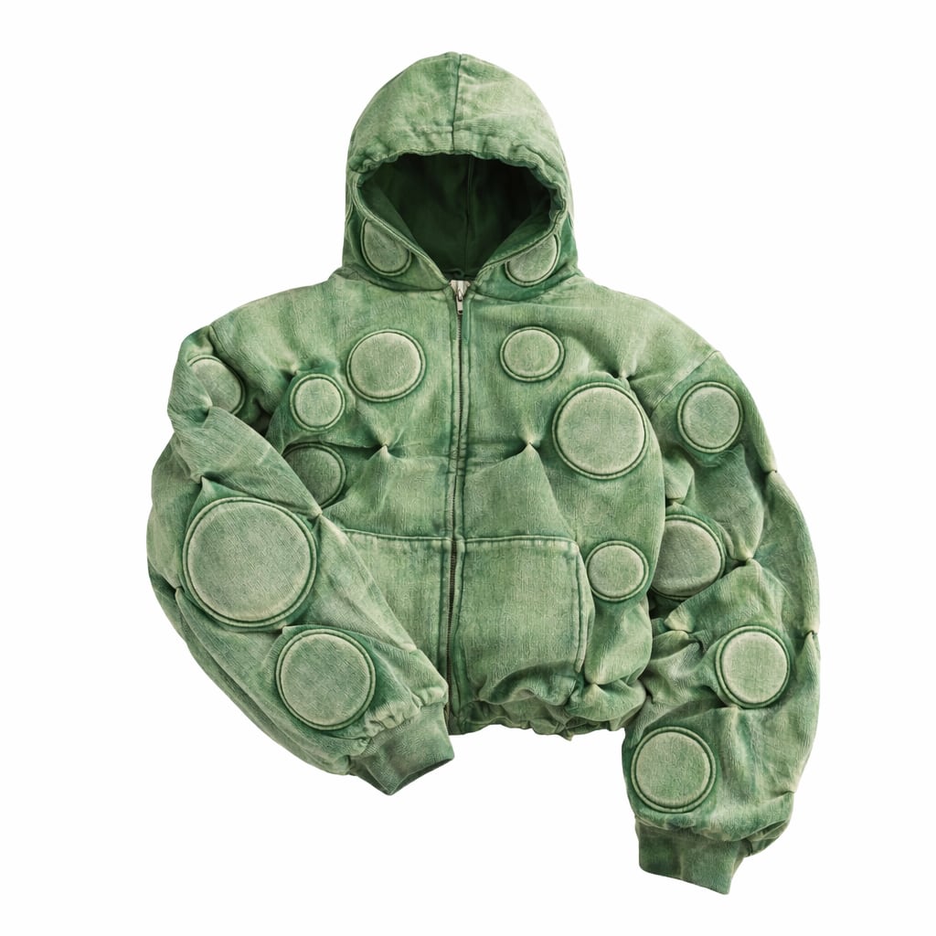 立体的なサークルパディングを全体に配置した、強い存在感を放つテックフーディ。MA-1やフライトジャケットの要領でも着用可能。無機質で近未来的なデザインと、丸みのあるボリュームシルエットが融合し、他にはない個性的な一着に仕上がっています。