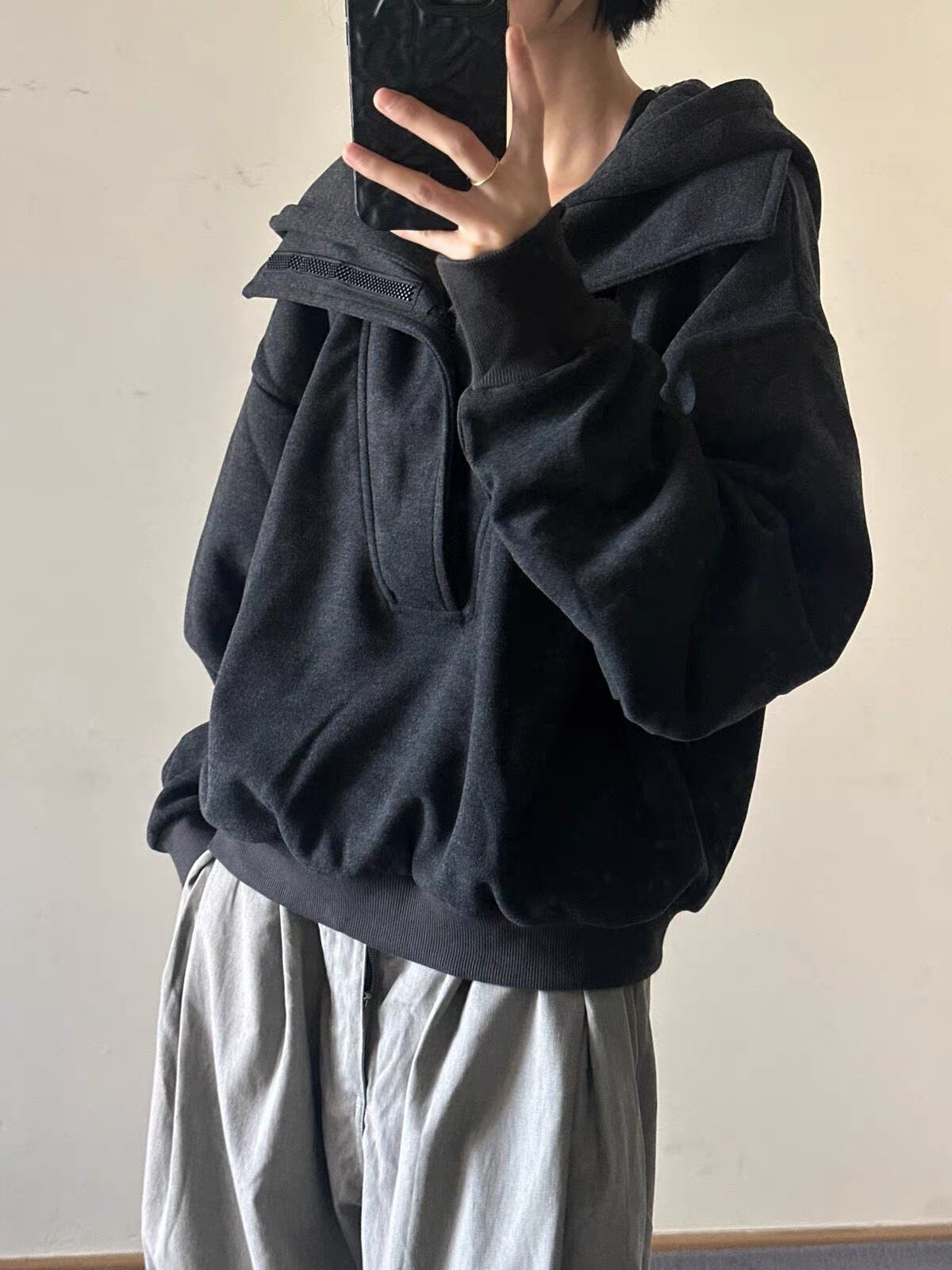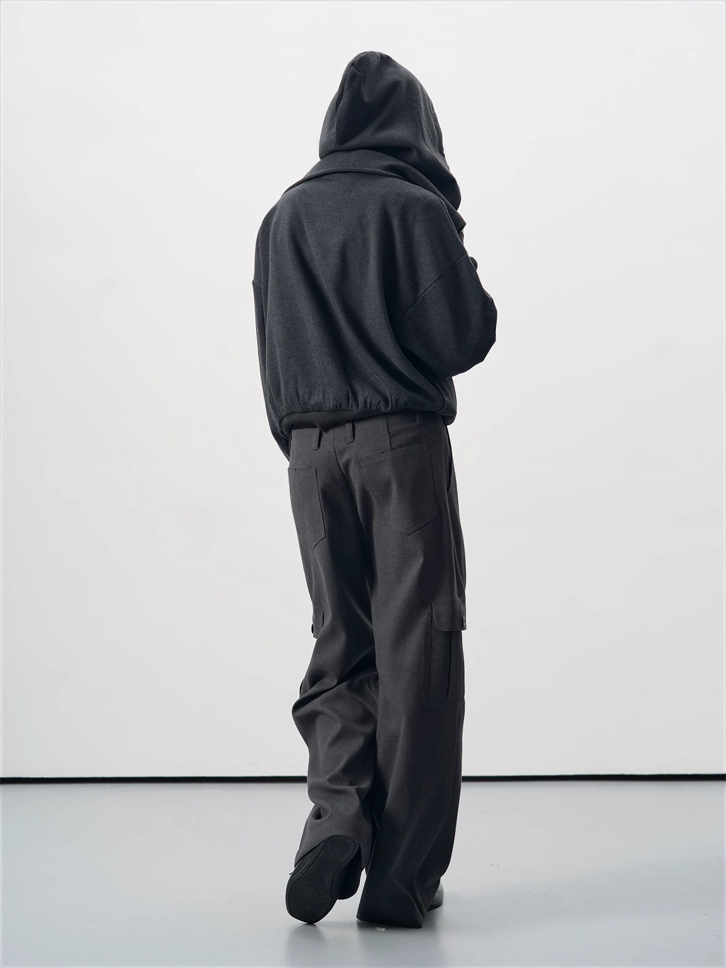 余計な装飾を削ぎ落とし、シルエットと素材感だけで成立させたノームコアなフーデッドジャケット。ゆったりとした身幅と自然に落ちる肩線が、日常の動作に溶け込むようなリラックス感を生み出す。フーディでありながらカジュアルに寄りすぎず、スラックスやミニマルなパンツとも相性が良い一着。ノームコアやミニマル、クリーンなモードスタイルと親和性が高く、ウールスラックスやタックパンツ、プレーンなレザーシューズと合わせることで都会的な印象にまとまる。