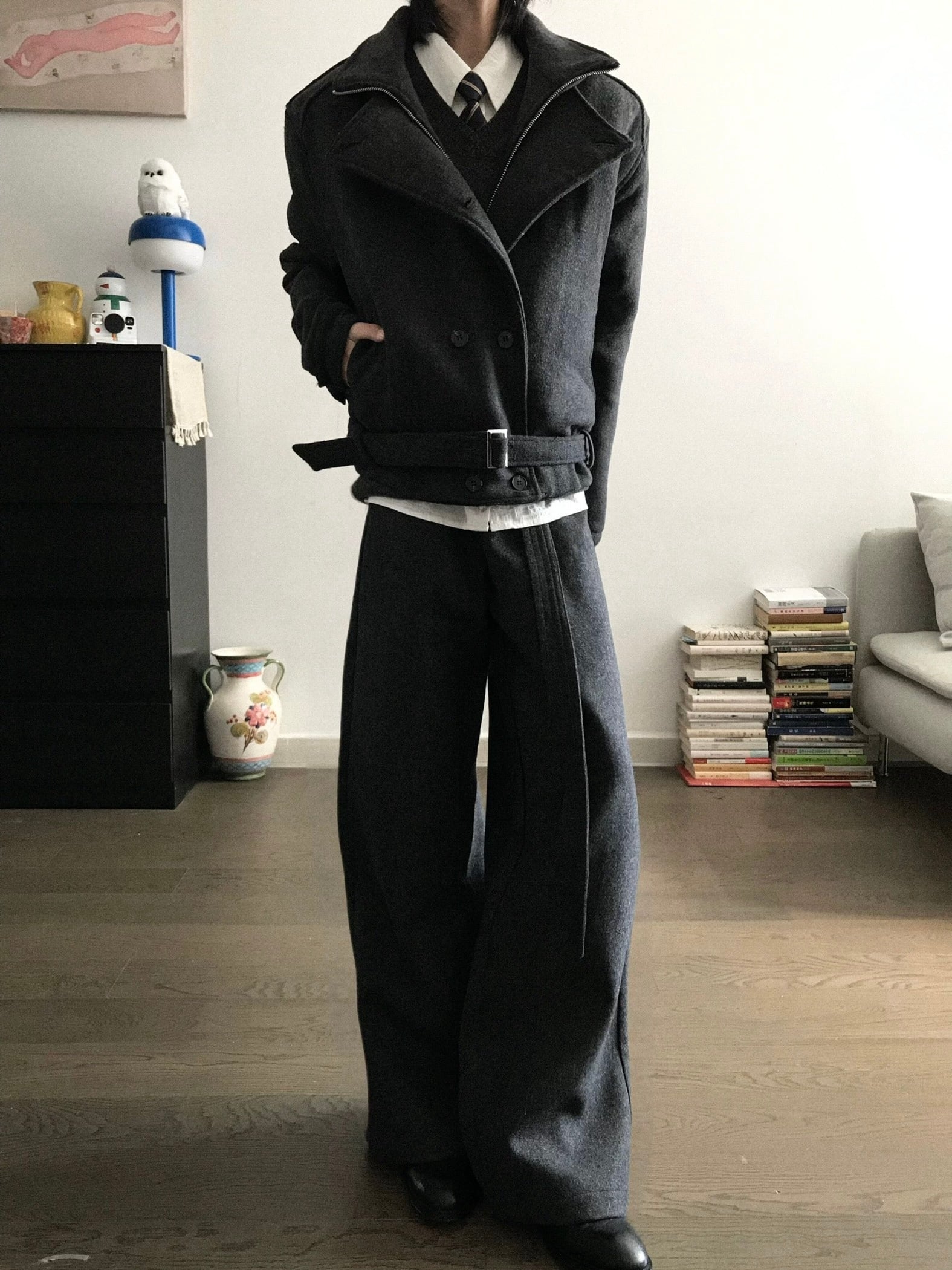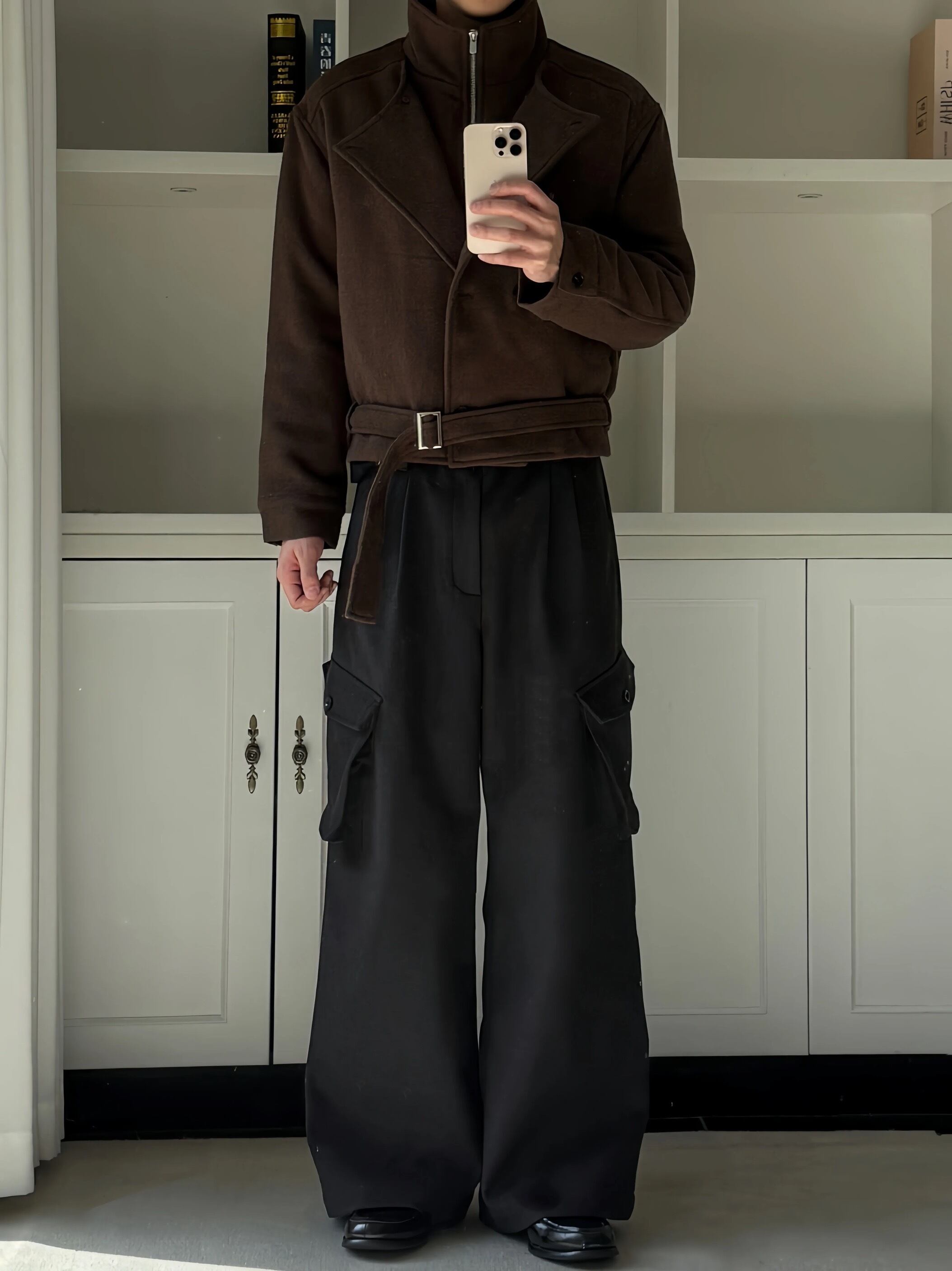 上質なメリノウール素材を使用し、ライダースジャケットをミニマルに再構築した一着。ウール特有の柔らかさと上品な落ち感が、従来のライダースにある無骨さを抑え、洗練された静かな印象を演出する。ショート丈のバランスとウエストのベルトディテールが全体を引き締め、立体的なシルエットを形成。スラックスやワイドパンツと合わせたモードスタイルはもちろん、インナー次第でクラシックにも振れる汎用性の高いアイテム。
