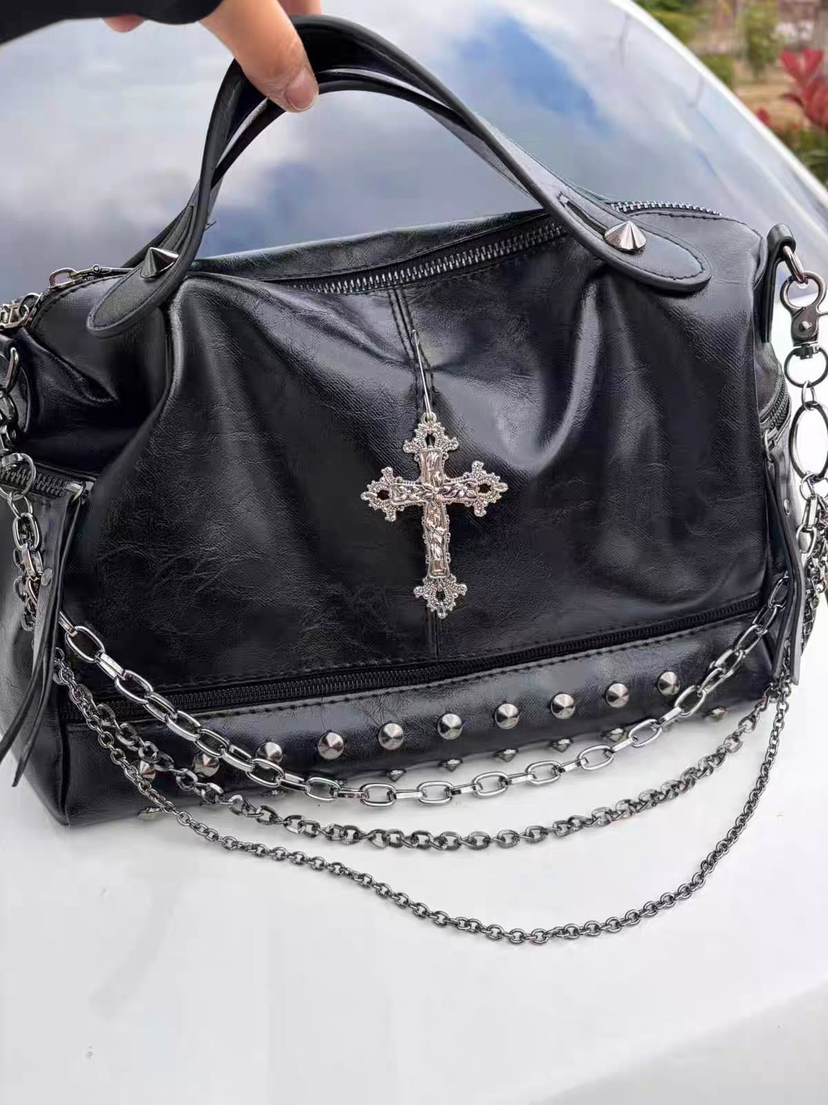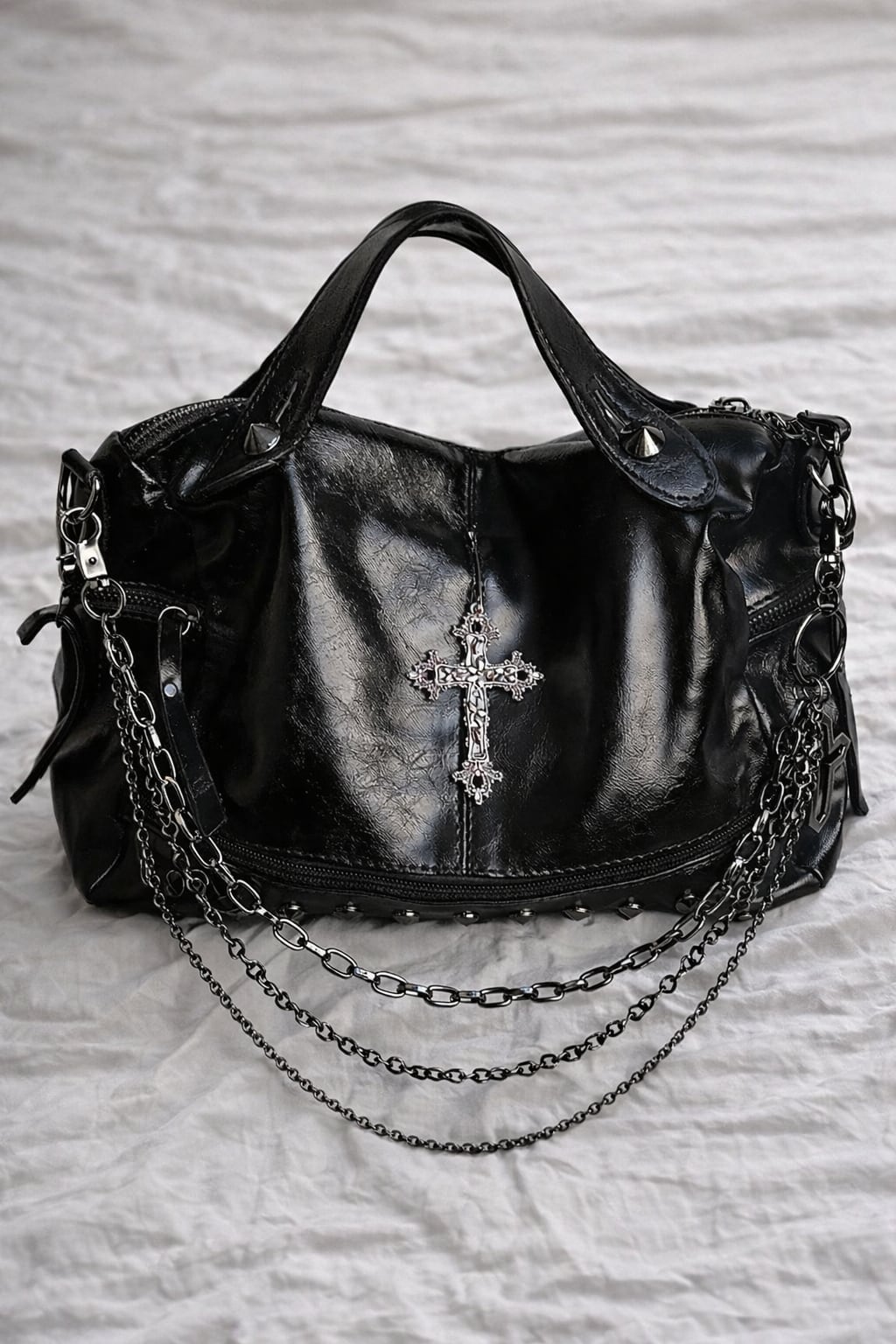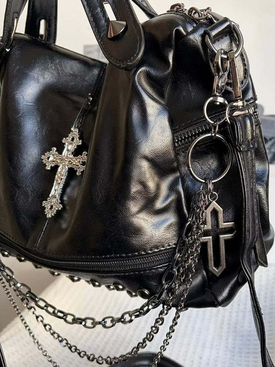 艶やかなブラックレザーに重厚なクロスモチーフを落とし込んだ、ゴシックムード漂うショルダーバッグ。フロントのクロス装飾と多連チェーンが存在感を放ち、スタッズディテールがエッジを加える。程よく丸みのあるフォルムがハードになりすぎず、モードやグランジ、Y2K、パンクスタイルとも好相性。レザージャケットやフレアデニム、ワイドスラックスと合わせることで世界観をより強く演出できる、主役級のバッグ。