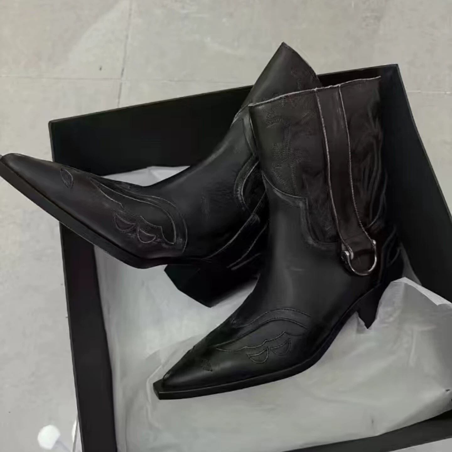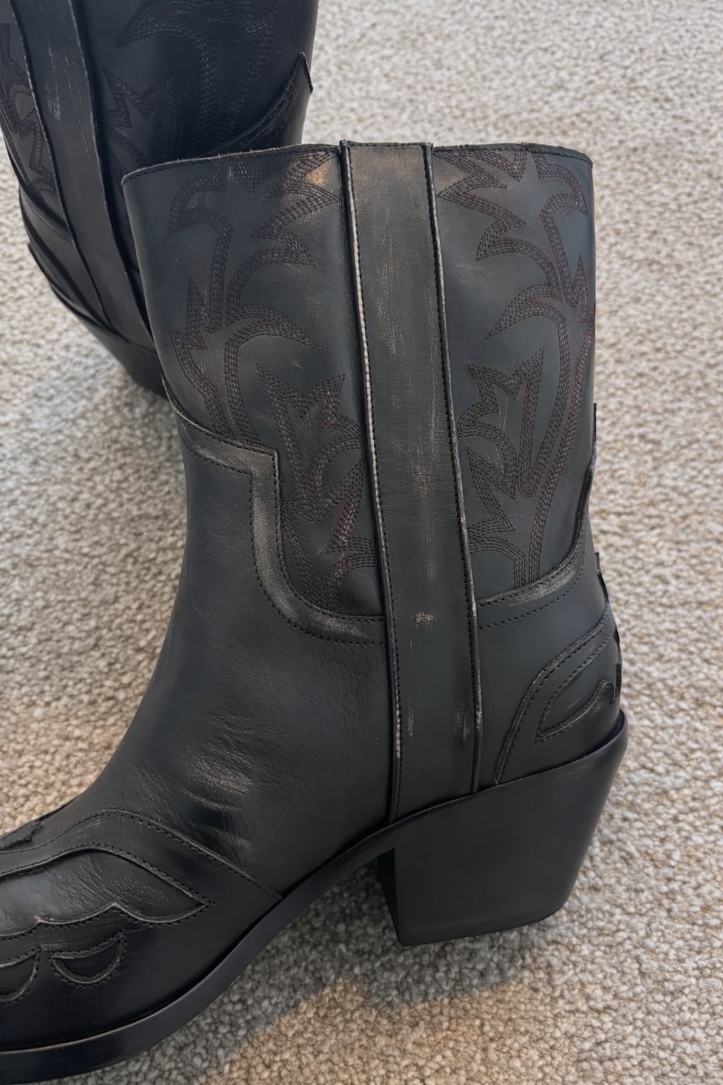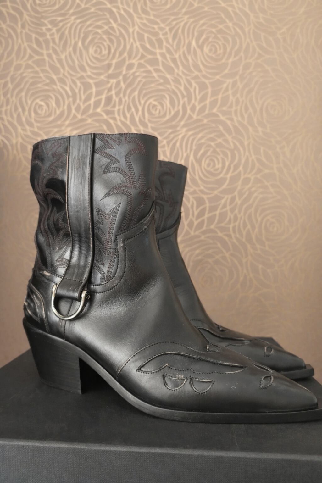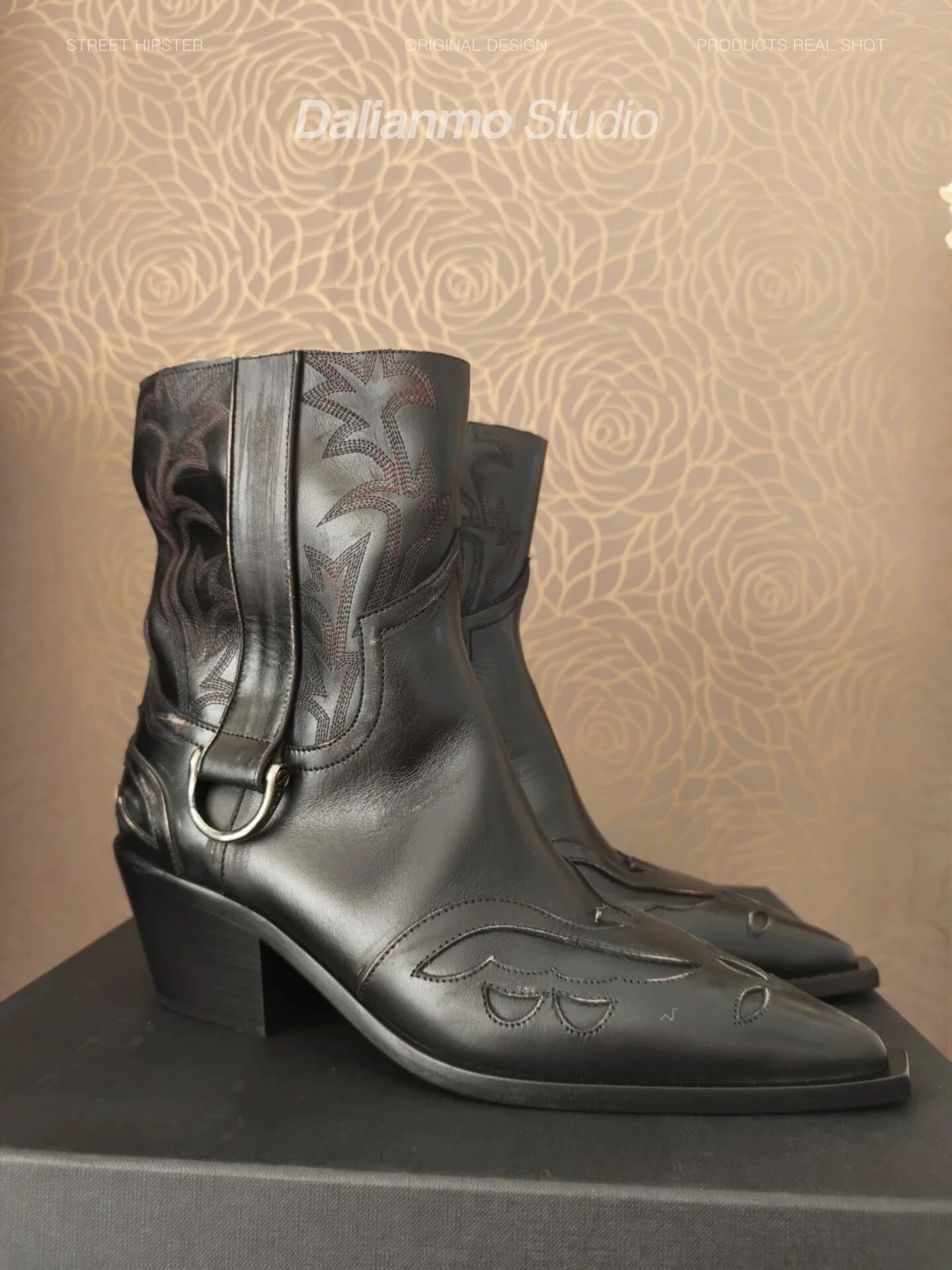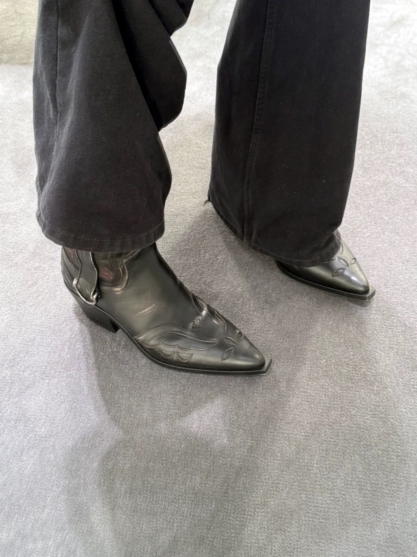 艶やかなブラックレザーに刻まれたトライバルパターンが静かに主張する、重厚感あふれるハーネスヒールブーツ。サイドに配されたメタルリング付きハーネスが無骨さを加えつつ、シャープなトゥと程よい高さのヒールが全体をモードに引き締める。ウエスタンの力強さとダークなアーカイブ感を併せ持ち、スラックスやフレアデニム、レザーパンツと合わせることで存在感のあるスタイリングが完成する一足。シンプルなトップスと合わせるだけでも足元から世界観を構築できる、主役級のレザーブーツ。