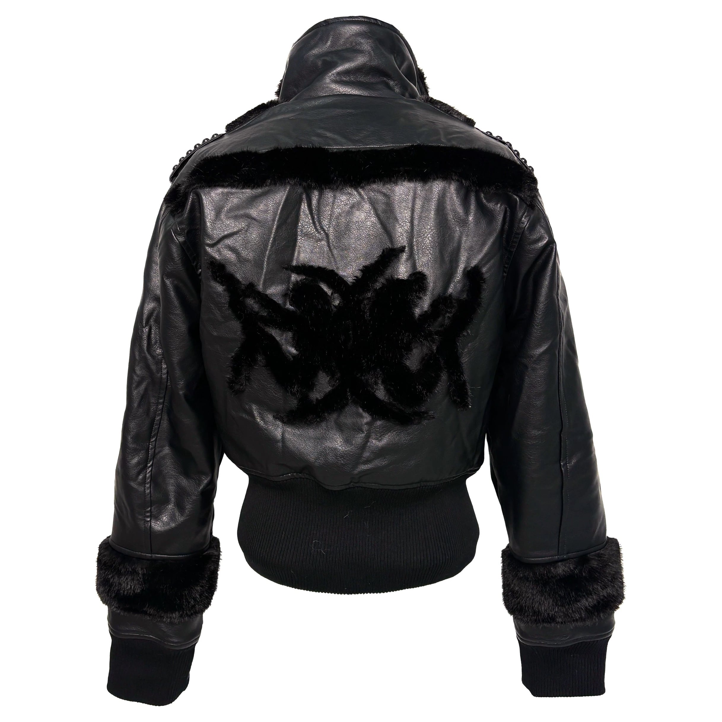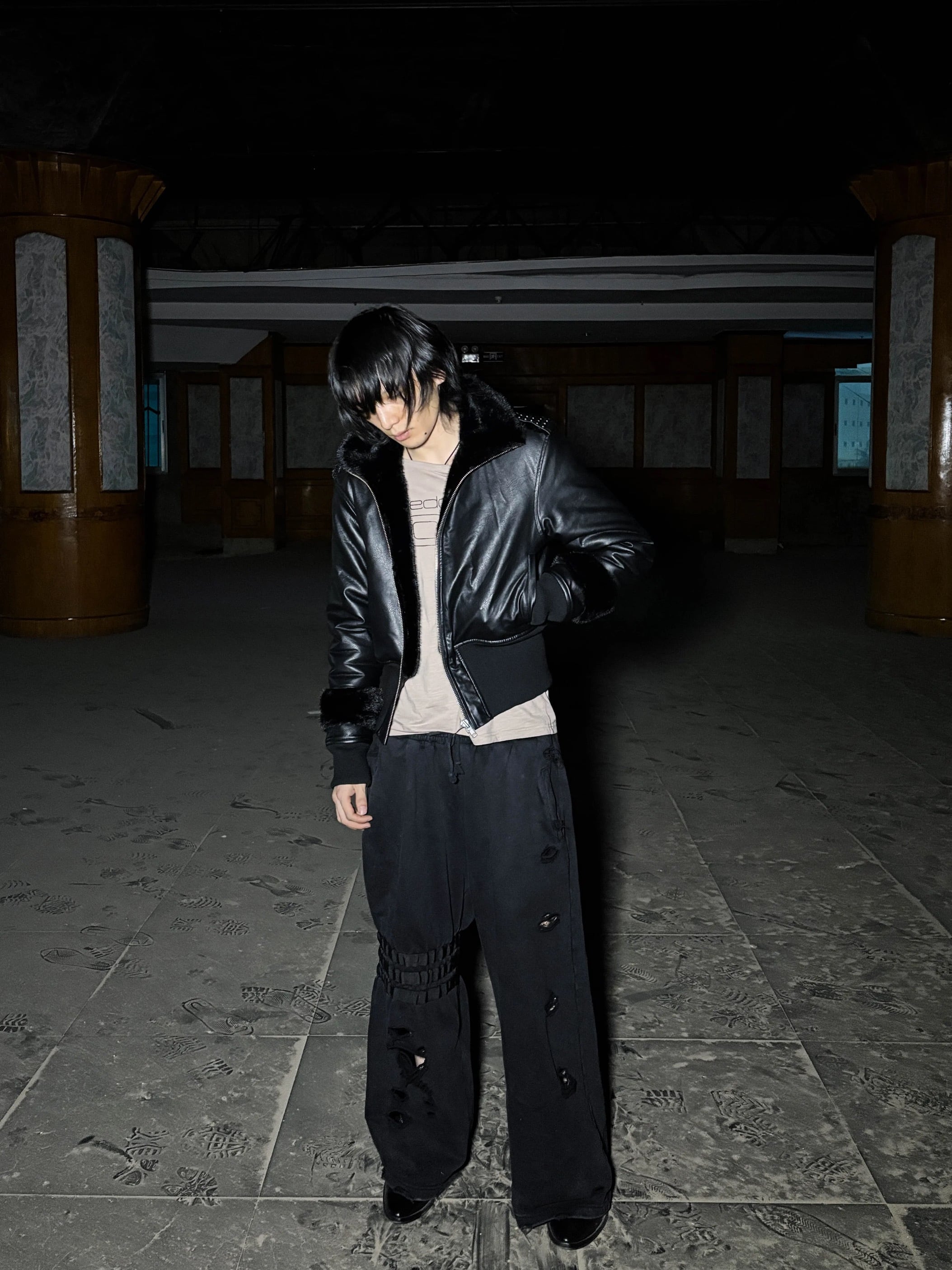 漆黒のレザーにシアリングをあしらったクロップド丈のボンバージャケット。ハイネックとリブ仕様がフライトジャケットの無骨さを残しつつ、背面のファーパネルが強い存在感を演出する。短丈とボリューム袖のバランスがモードなシルエットを形成し、ワイドパンツやレザーボトムと好相性。00sアーカイブとミリタリーを融合させた主役級アウター。ユニセックスで着用可能。