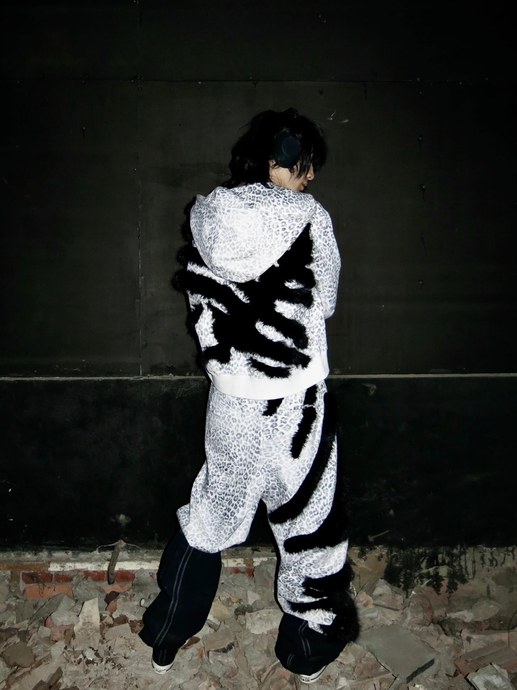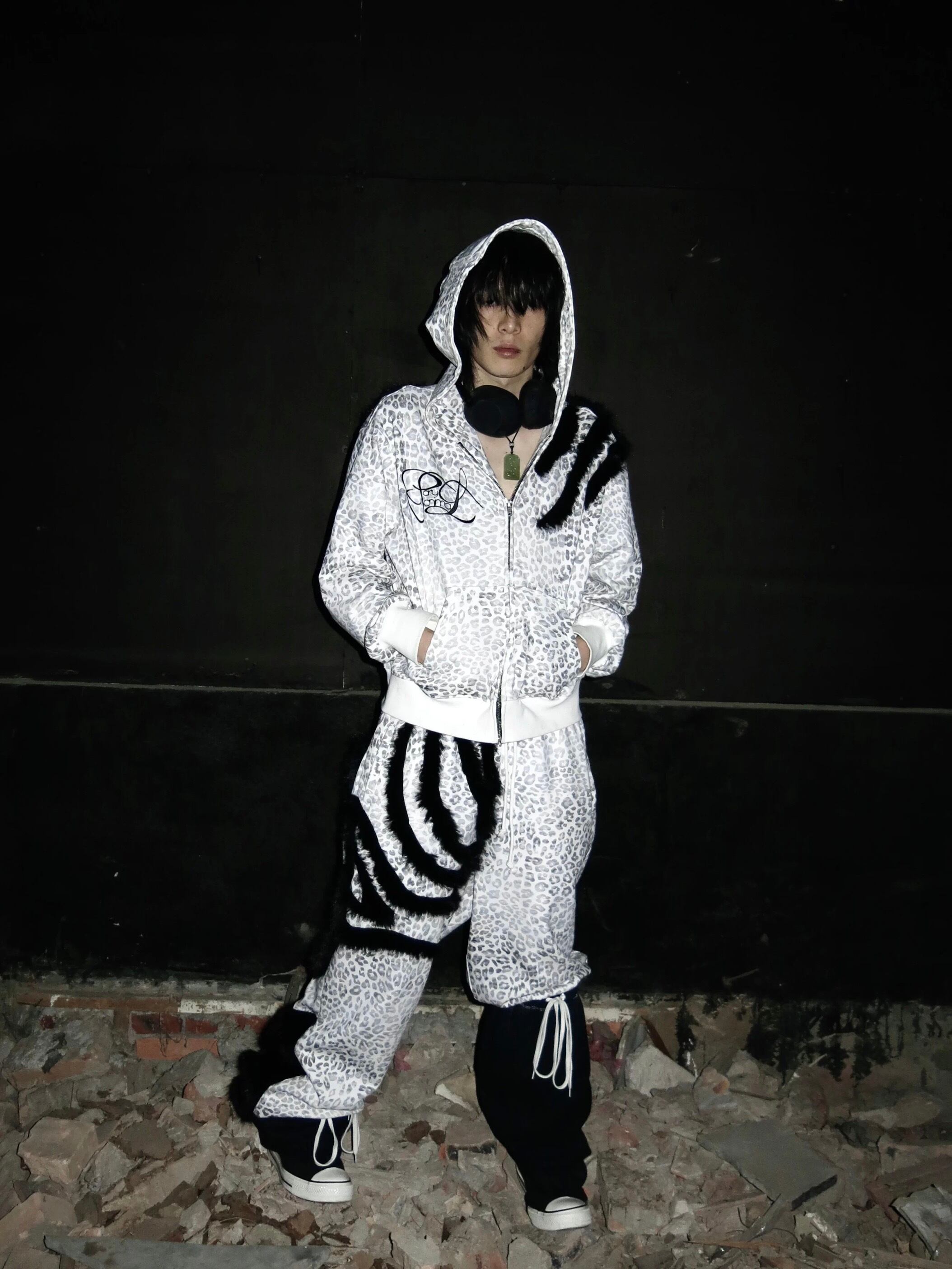 レオパード柄をベースに、背面へ大胆に走るブラックファーラインが牙のような存在感を放つジップフーディ。荒々しさとラグジュアリーを融合させたデザインが、Y2Kムードとダークストリートの空気感を強く演出する。程よくルーズなシルエットがスタイリングに抜けを生み、フレアデニムやワイドボトムと合わせれば攻撃的な00sアーカイブスタイルに。視線を奪う主役級アウター。ユニセックスで着用可能。