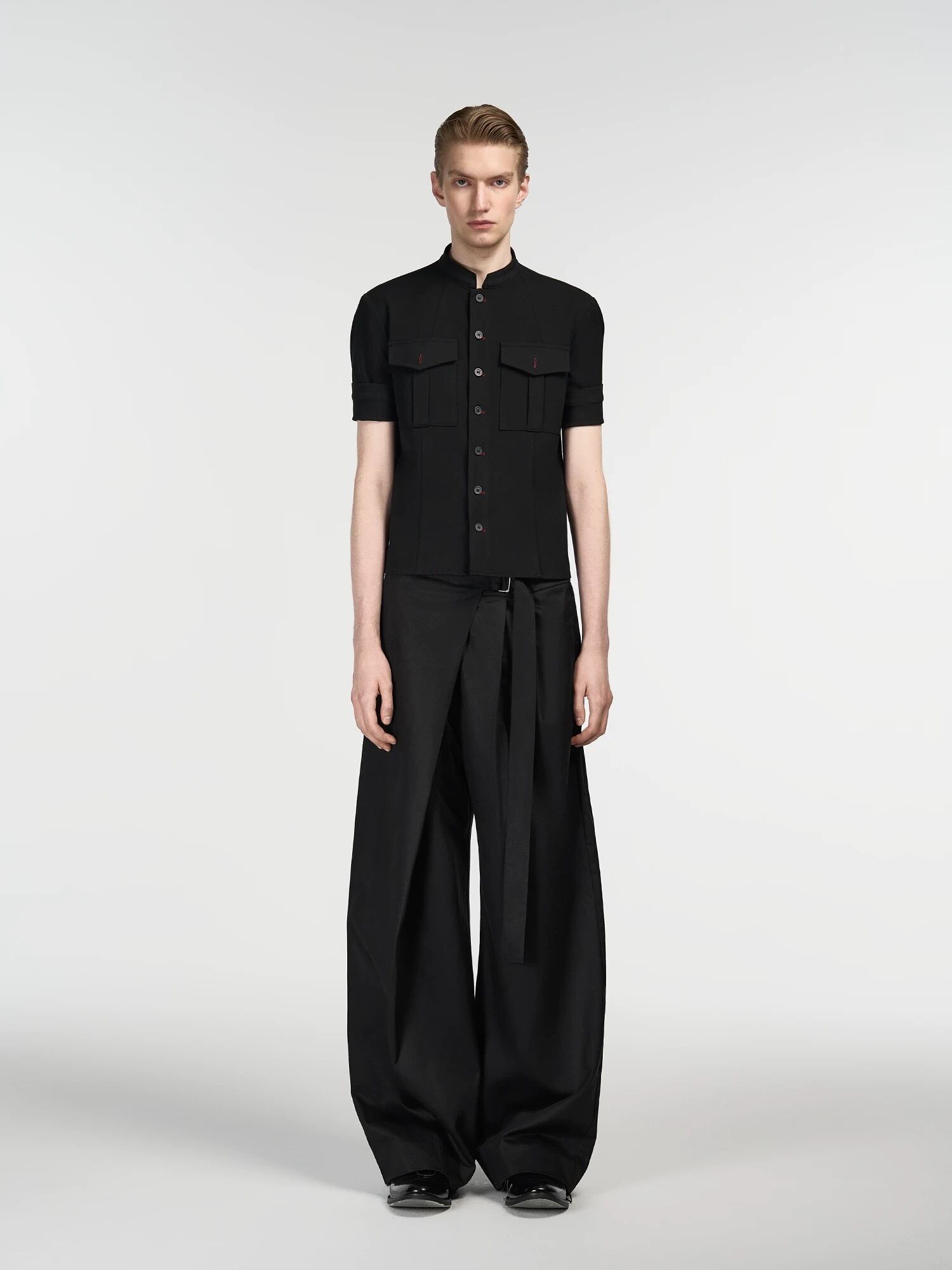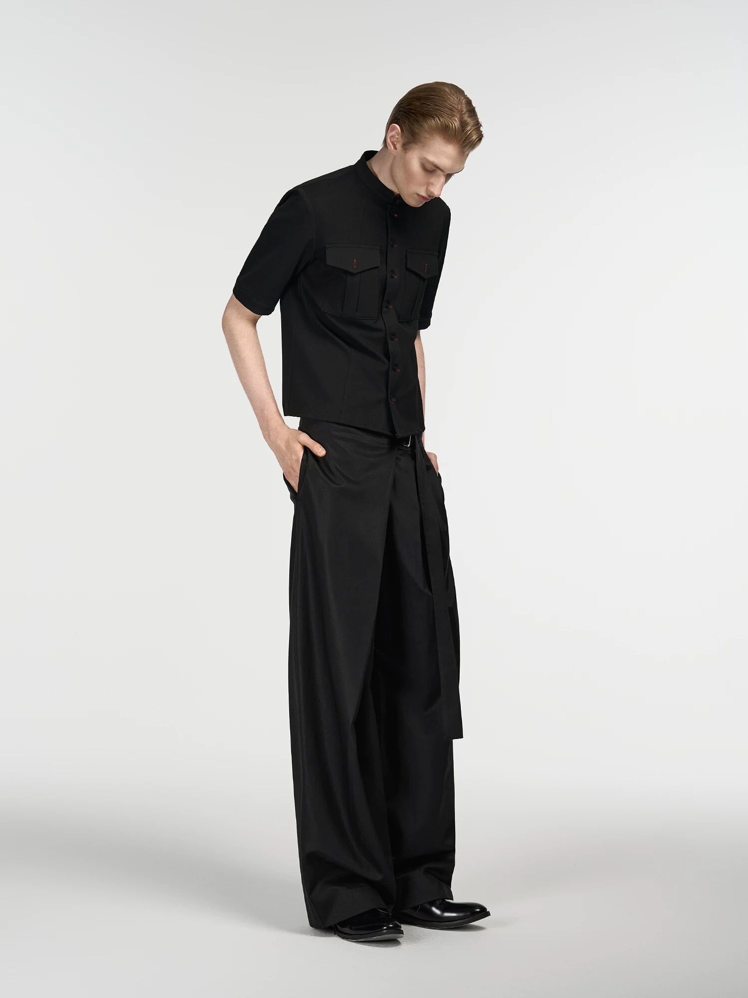 アシンメトリーワイドスラックス。斜めに重なるラップデザインとベルトディテールが視線を引き寄せ、シンプルなトップスを合わせるだけでスタイリングを格上げする一本。歩くたびに揺れるワイドシルエットが、圧倒的な存在感を演出する。