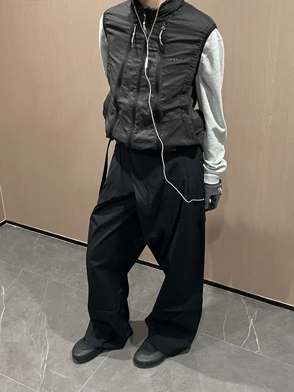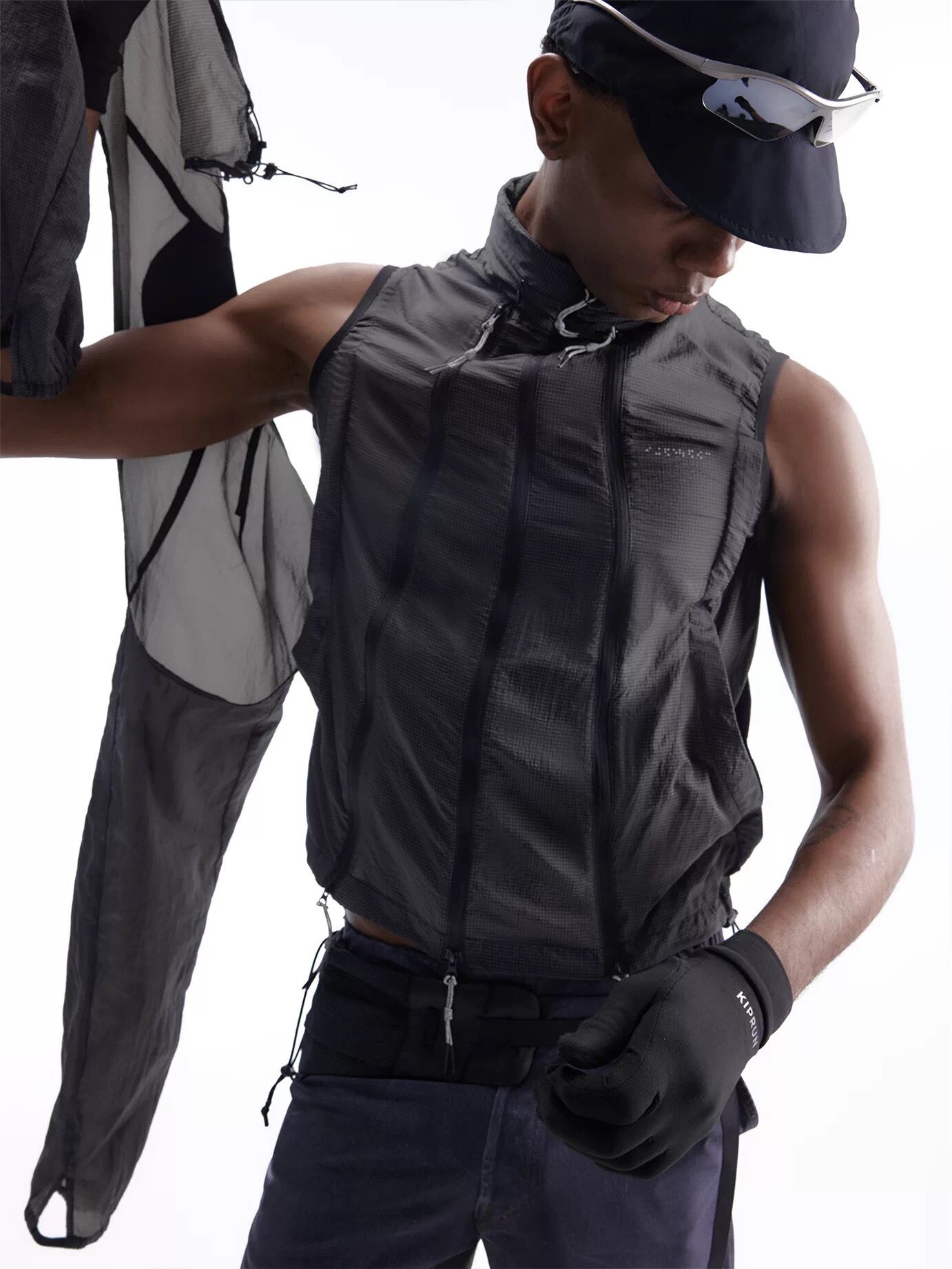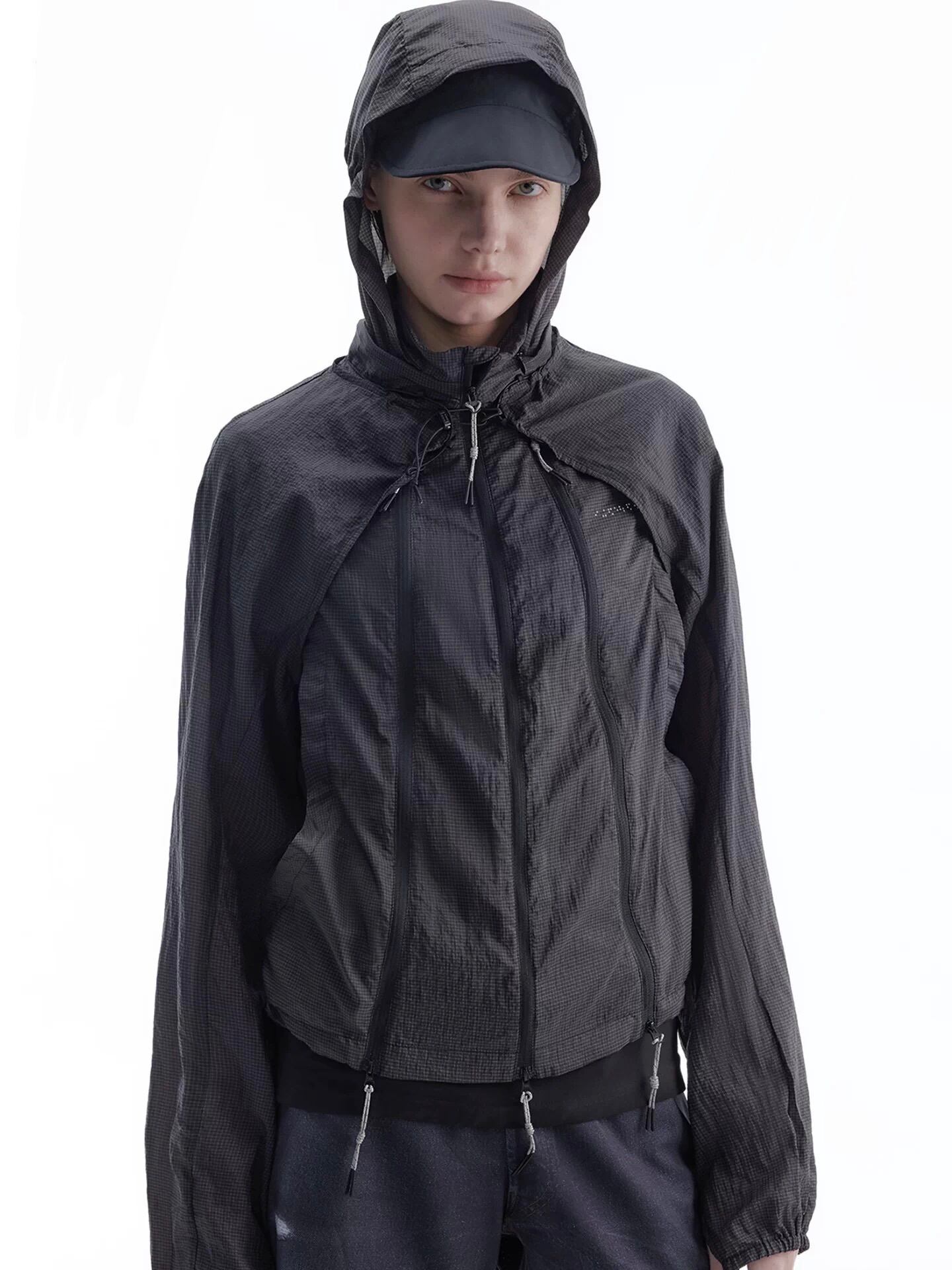 軽量なテクニカル素材に、フロントを走るドローコードディテールと立体的な構造を掛け合わせた存在感のある一着。シャープなシルエットの中に機能性を落とし込み、都市的で近未来的なムードを強く演出している。さらに切り替えによるアレンジが可能で、スタイリングや気温に応じて異なる表情を楽しめるのも魅力。Arc’teryx や sansangear のようなテクニカルな雰囲気を感じさせながら、よりファッションとして映えるバランスに仕上がっている。