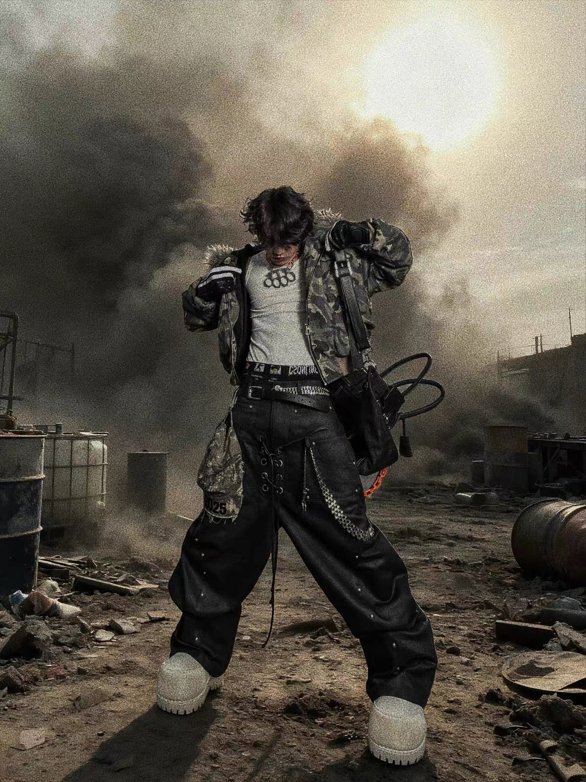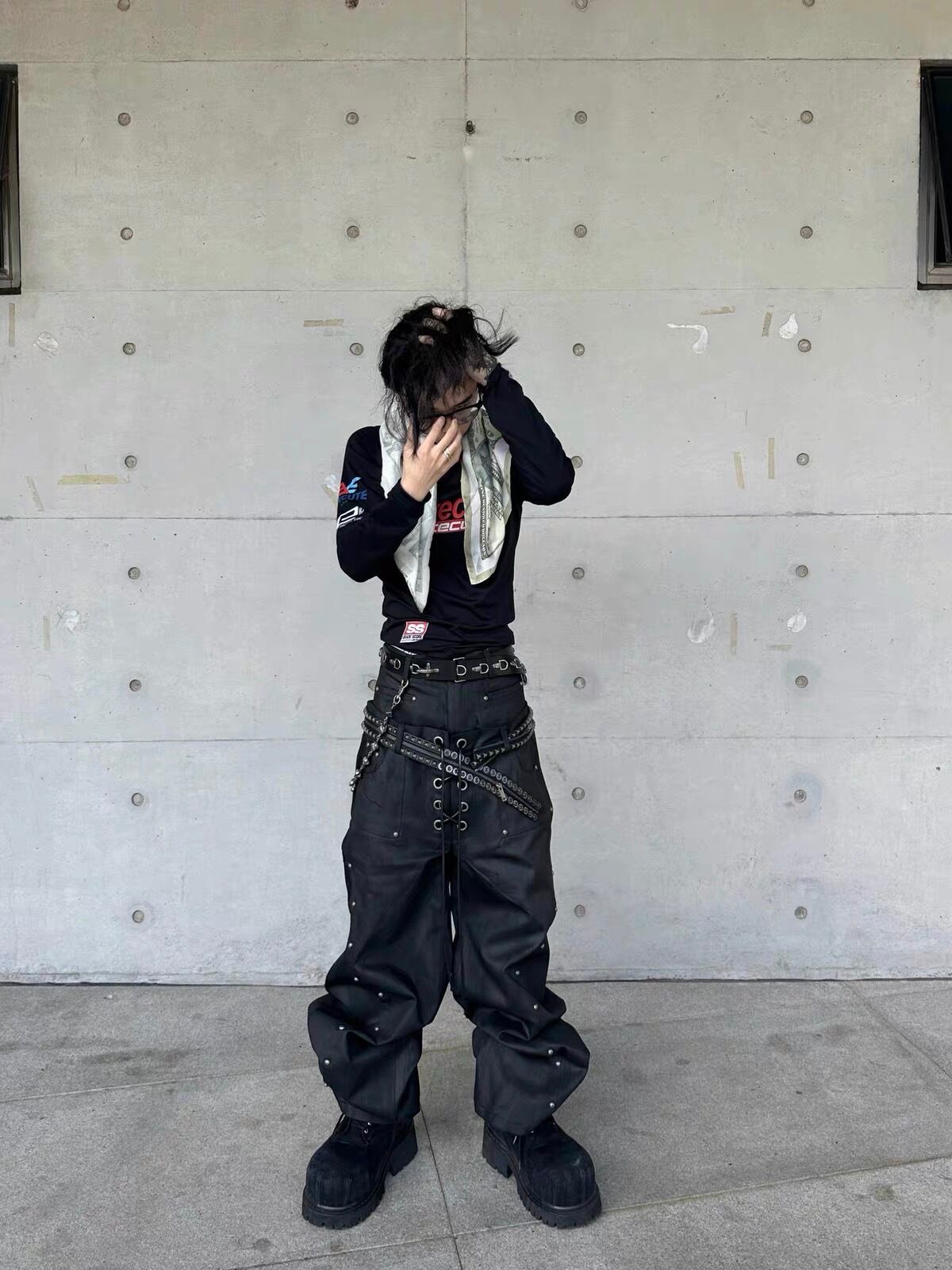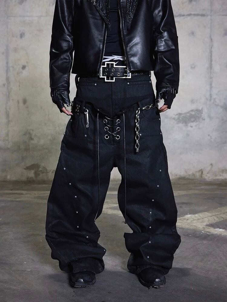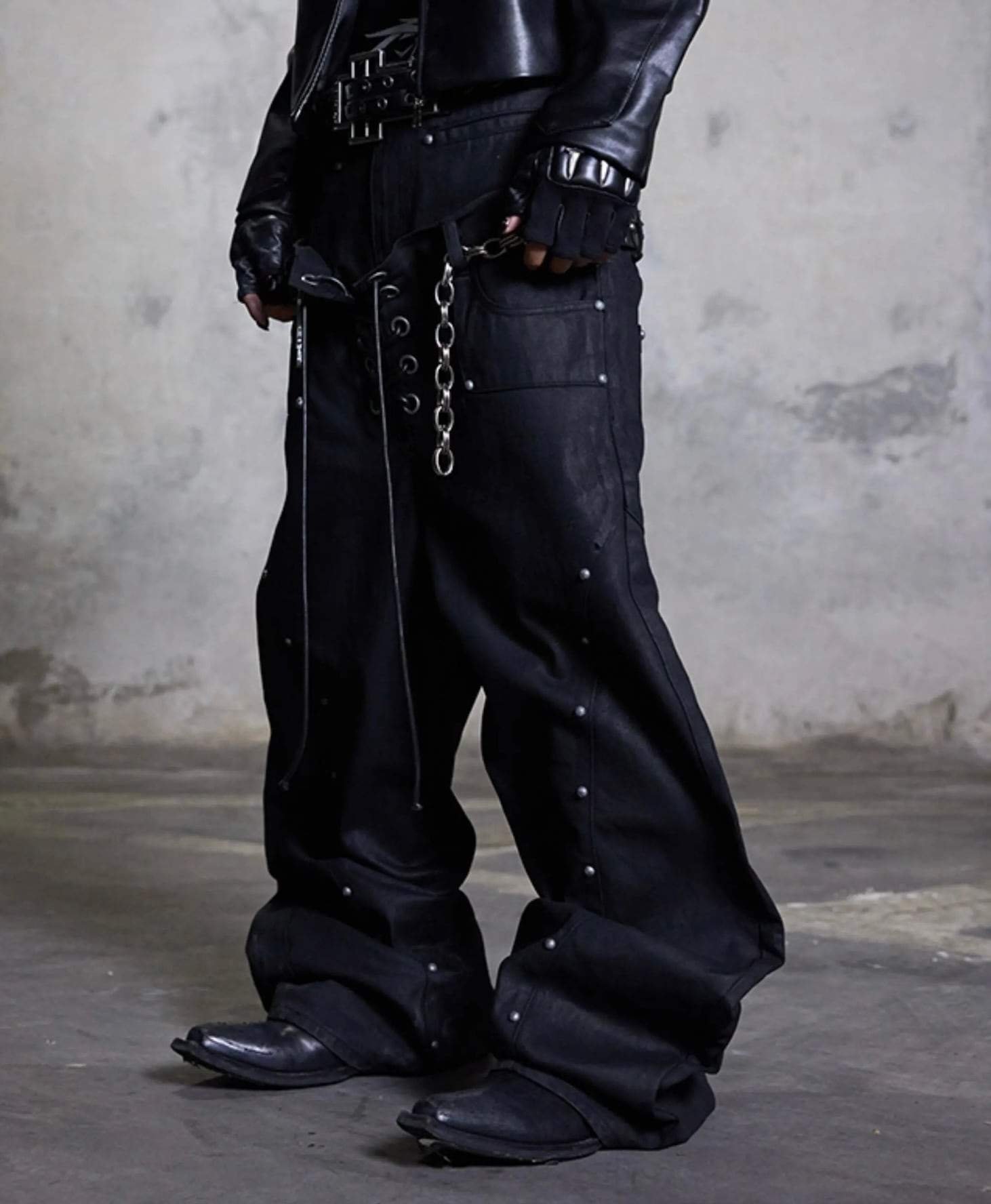 フロントのレースアップディテールを核に、深く落としたサグシルエットと重厚なワイドバランスで仕上げた、退廃的なムード漂う一本。無機質なリベットワークやチェーンディテールが全体に鋭さを与え、ダークトーンでまとめたスタイリングに圧倒的な存在感を加える。短丈のレザージャケットやタイトなトップス、エンジニアブーツと合わせることで、退廃美と未来感が交差するようなモードな空気感を演出。リック系やダークウェア、ゴシック、インダストリアルなスタイルが好きな方にも刺さる、主役級のサグデニムです。
