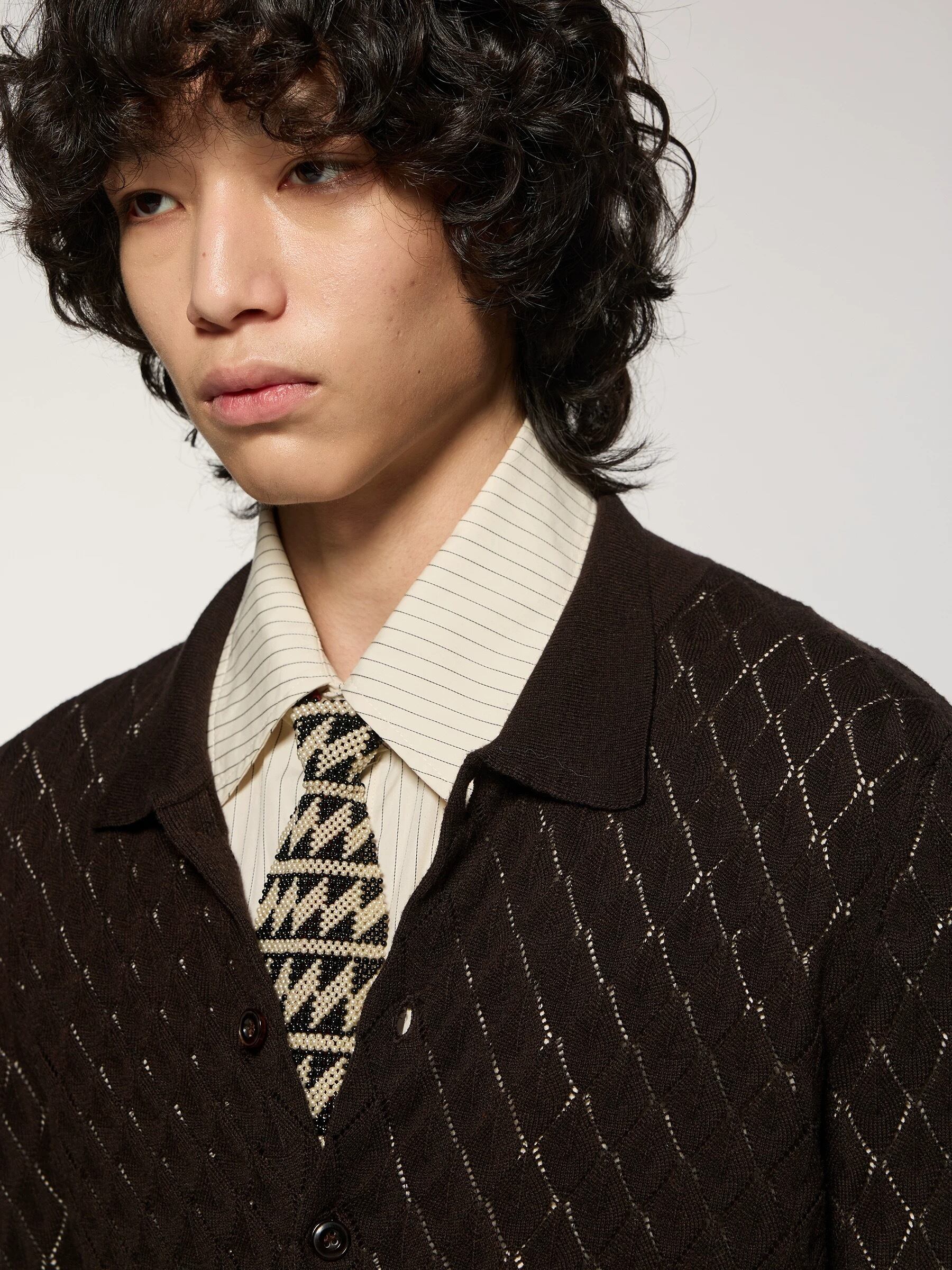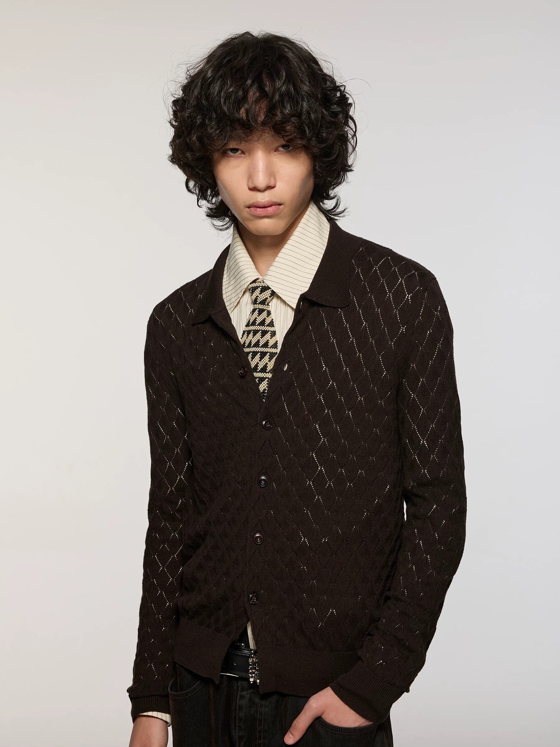 繊細な透かし編みとダイヤ調の柄が印象的な、ムードのあるニットカーディガン。深みのあるダークトーンに、ほどよく抜け感のある編み地を重ねることで、上品さと色気を両立した一着に仕上がっている。シャツやネクタイと合わせて綺麗めにまとめるのはもちろん、ワイドパンツやフレア、レザーパンツと合わせてモードやアーカイブ感のあるスタイリングにも自然に馴染む。インナー次第で表情が変わるため、季節の変わり目の主役としても活躍する一枚。