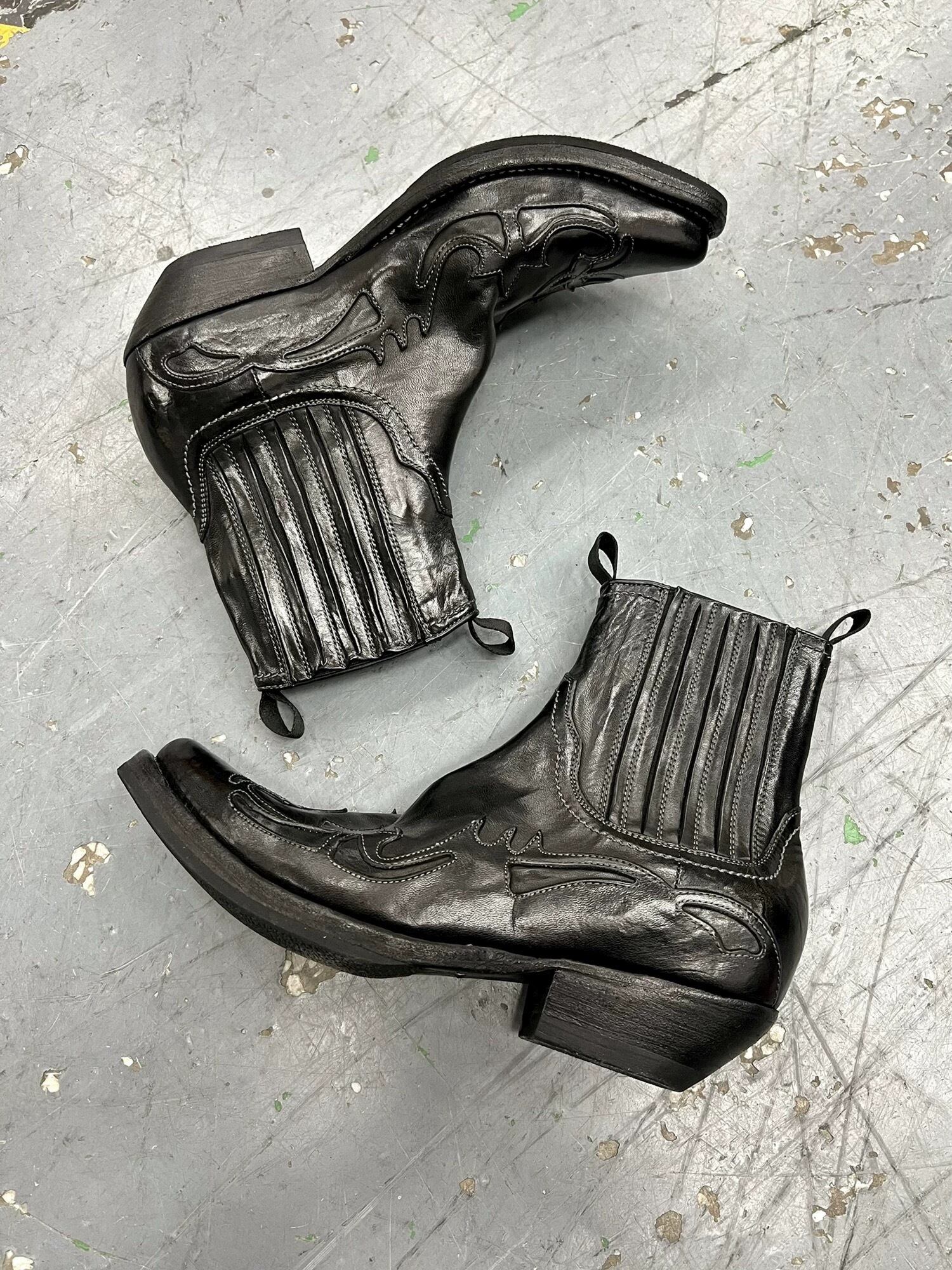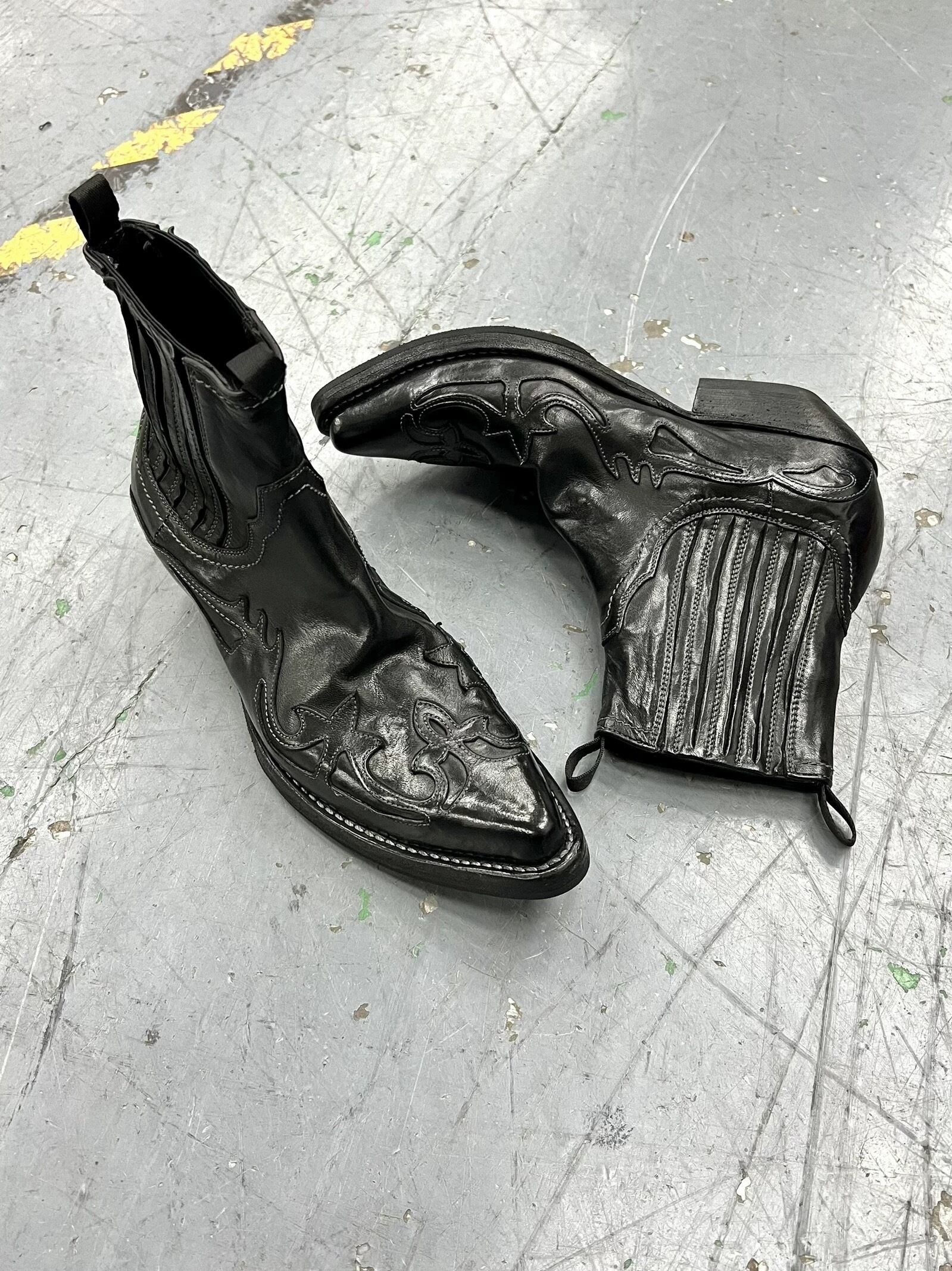 重厚感のあるブラックレザーに、鋭く走るトライバル調の切り替えが映えるヒールブーツ。シャープなトゥと程よい高さのヒールが足元に強い存在感を生み出し、無骨さと色気を兼ね備えた一足に仕上がっている。ウエスタンの空気感をベースにしながら、アーカイブやダークモードなスタイリングにも自然に溶け込み、フレアパンツやワイドスラックス、細身のボトムスまで幅広く合わせやすい。履くだけでコーデ全体を引き締め、退廃的で洗練されたムードを加えてくれるアイテム。